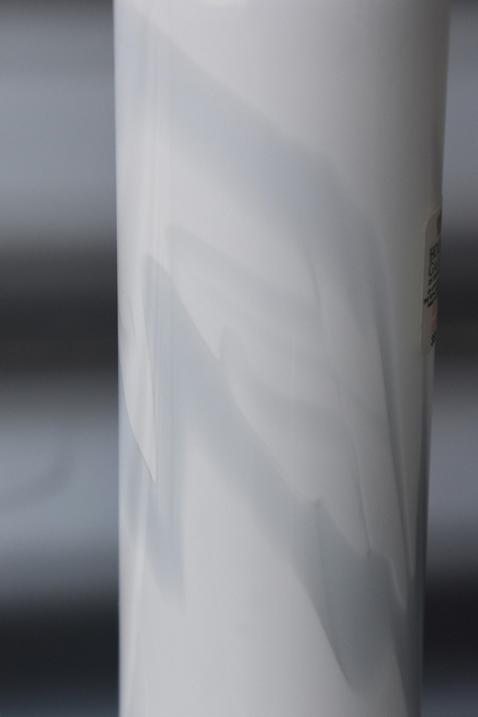 Lampen er lavet i hvidt opalineglas med et svagt blåt, bølget mønster