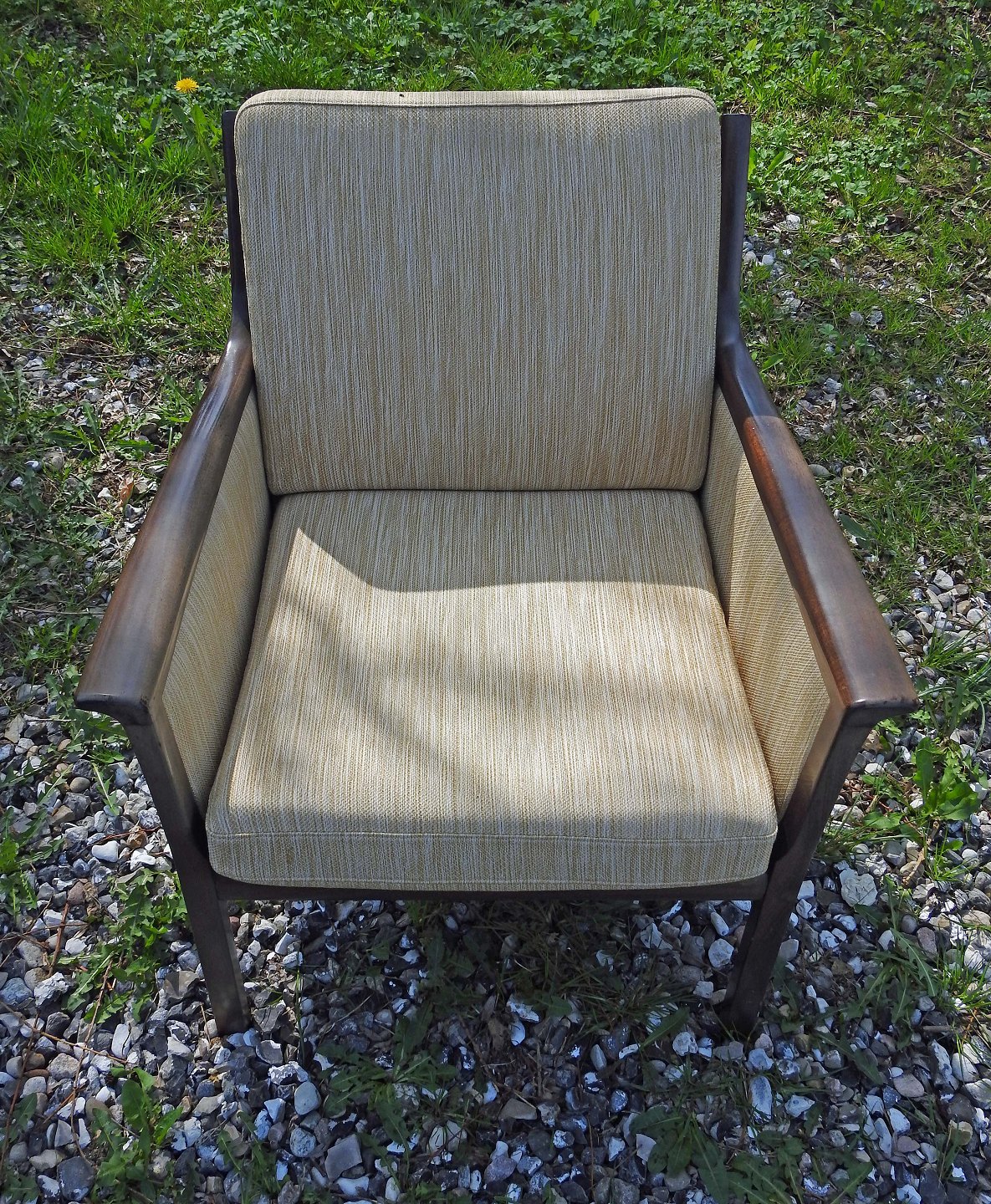 Fremstår med stel af lakeret men solbleget mahogni og intakt gyldenmeleret uldbetræk. Lettere brugsspor på ben.