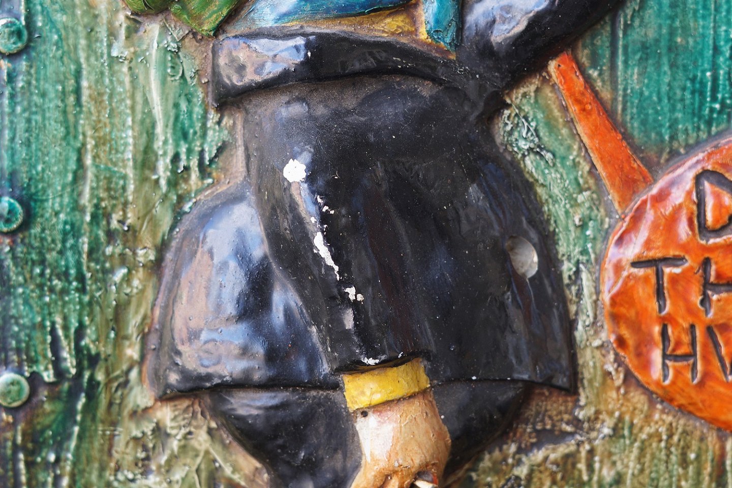 Klassiske reklameskilt, lak/oliemaling på metal, Kasket Karl der reklamerer for Thor Bryggeri, Randers