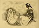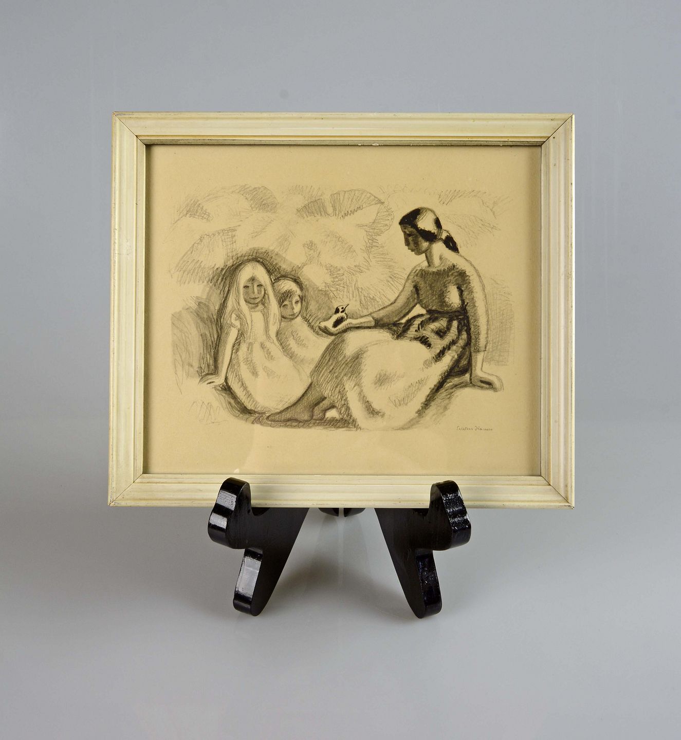 Tryk med siddende kvinde med fugl i hånd samt to børn af Sikker Hansen