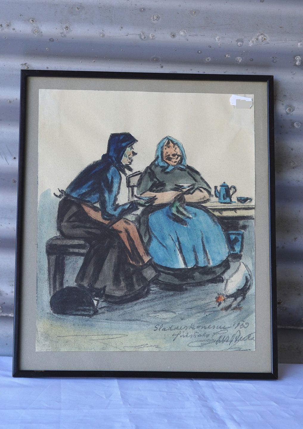 Oliekridt tegning af Sladderkonerne, Hirtshals