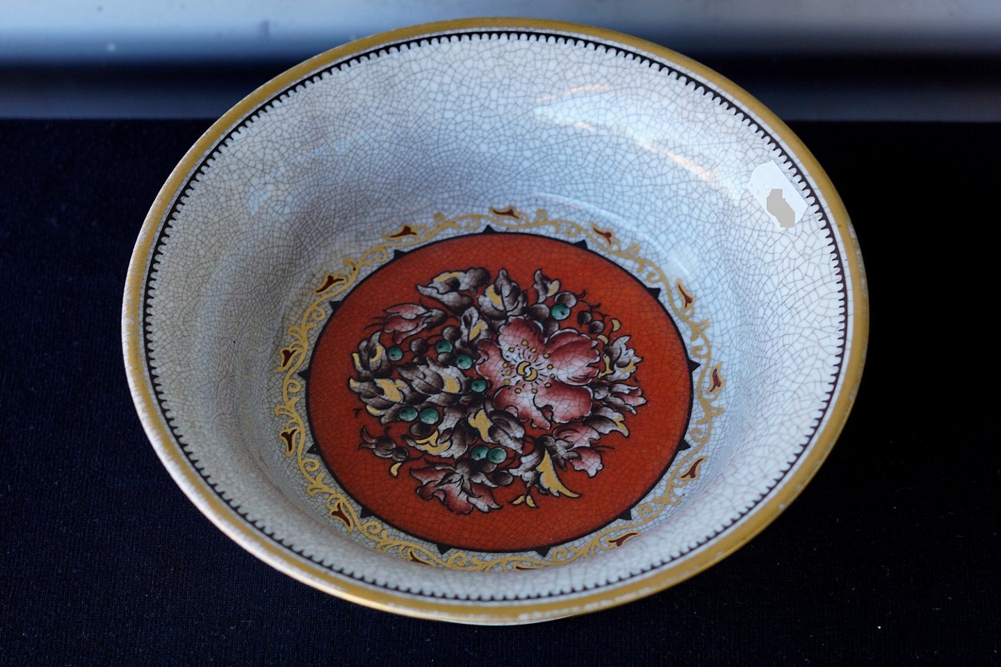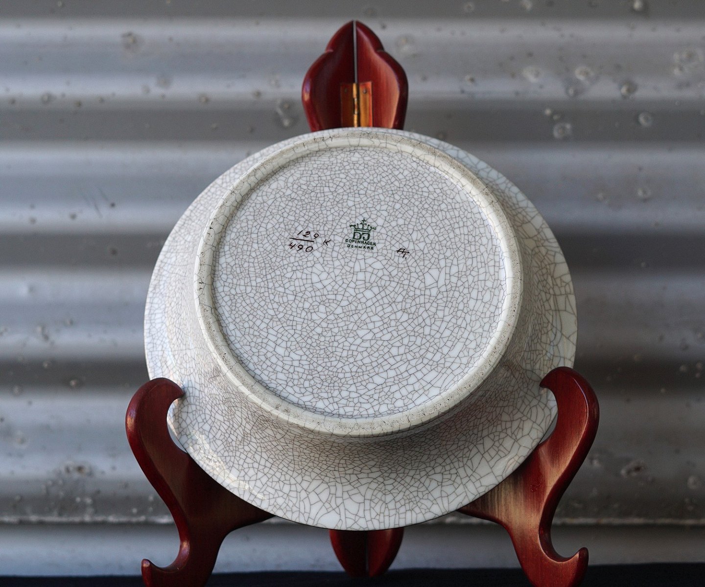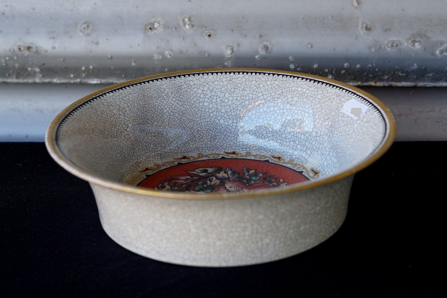 Krakelé porcelæns skål nr 129/490 med typisk bemaling fra Dahl Jensen, med hvide grålige og mørkerøde farver og guld kanter