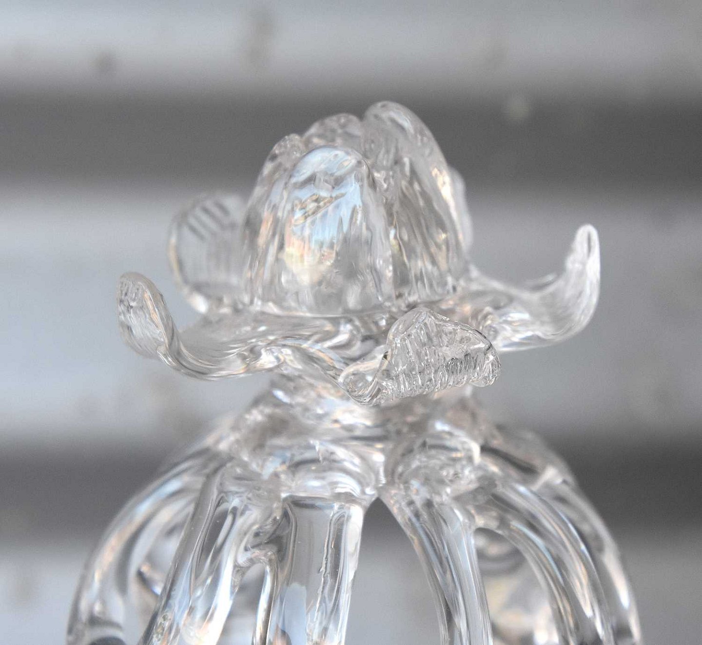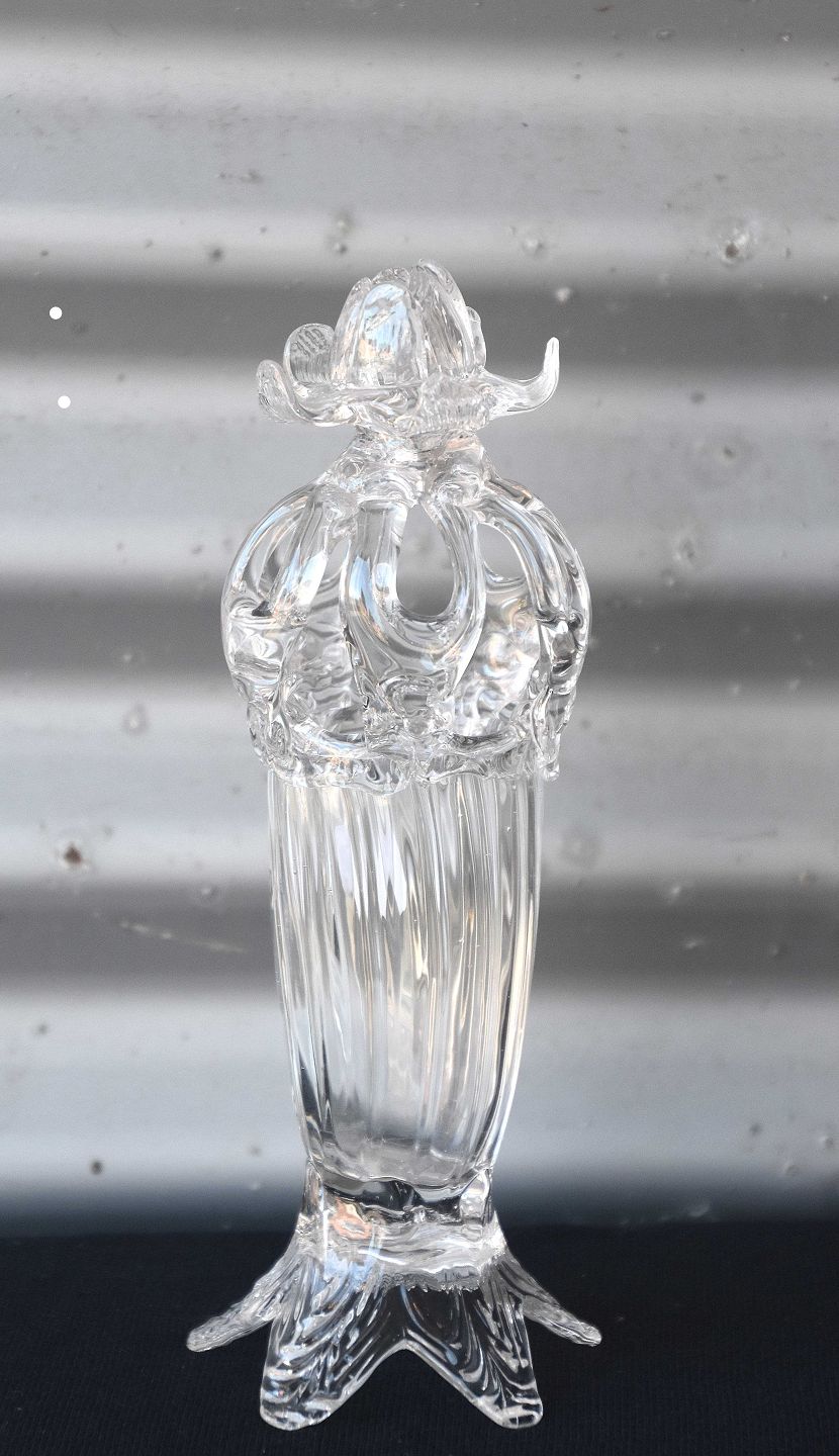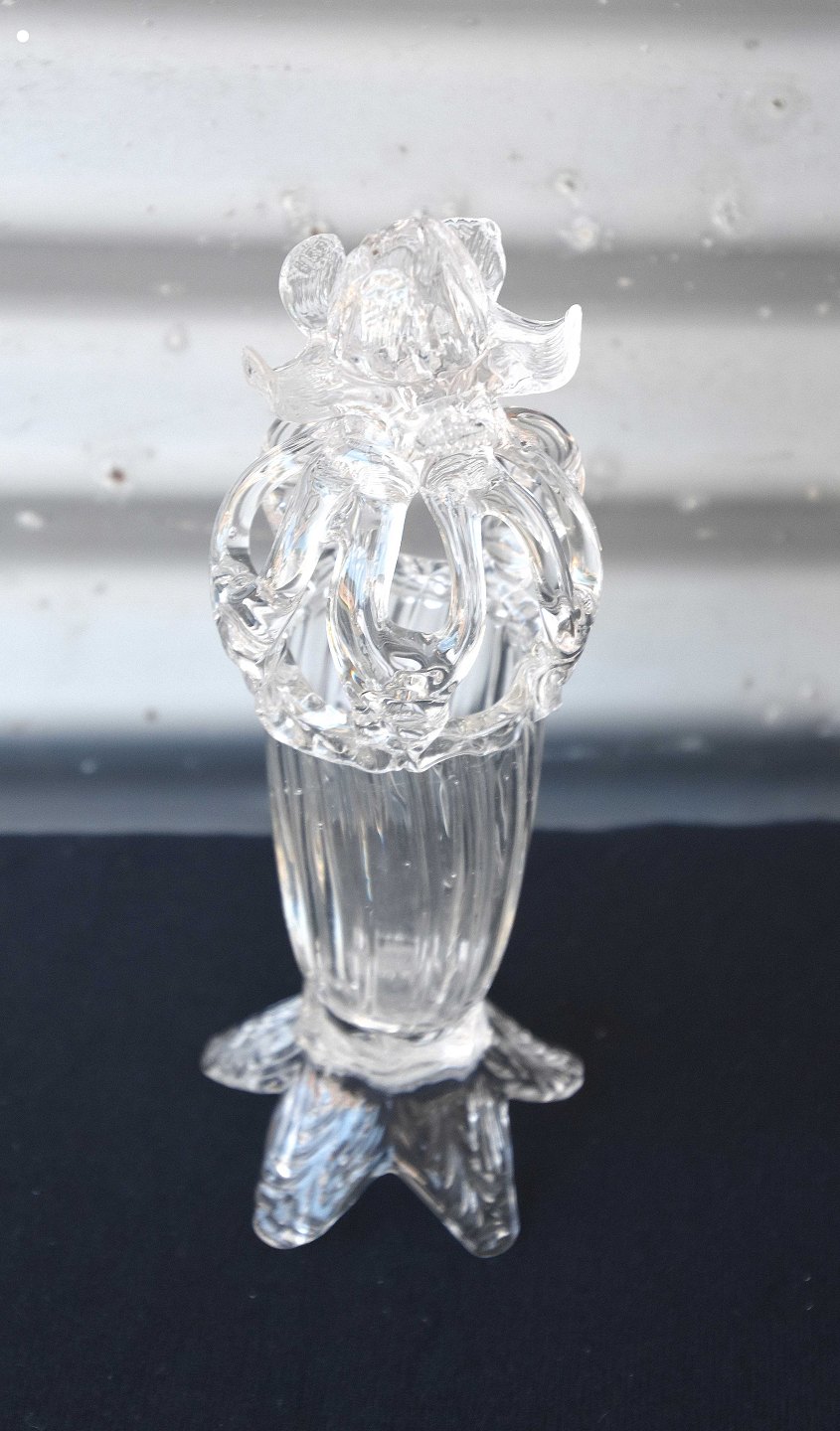 Blomster vase med et kompliceret net af rigler langt ind mod midten, der giver vasen et udtryk af "Kongekrone"