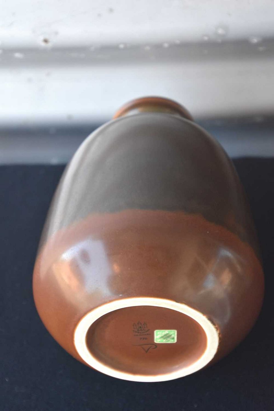 Vase, nr. 776, af stentøj med glasur der gør at vasen changerer i brunlige farver. Vasen er med monogram VP
