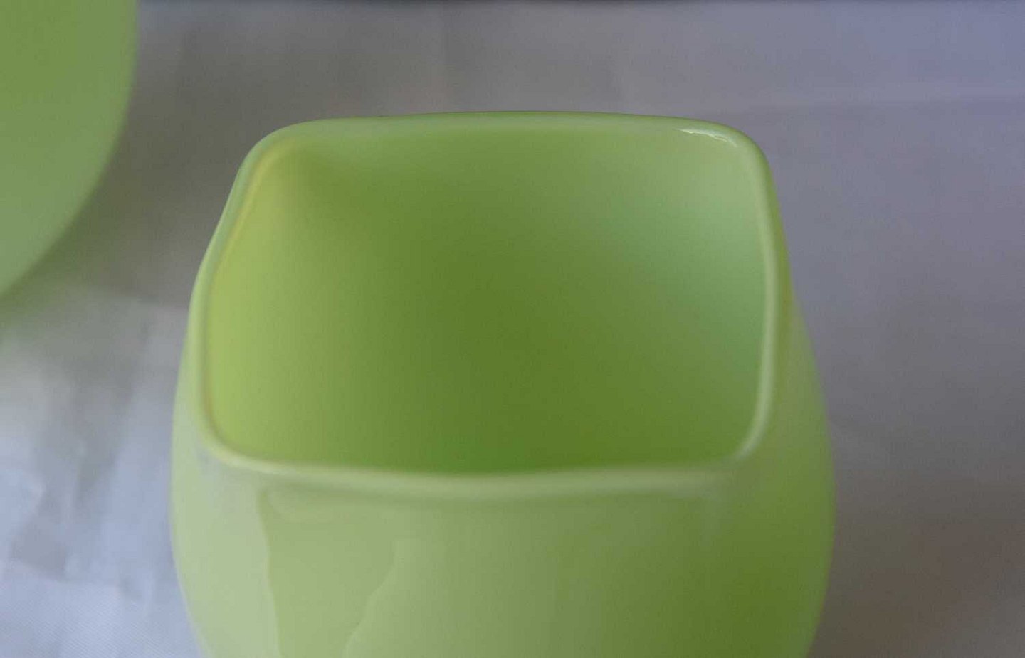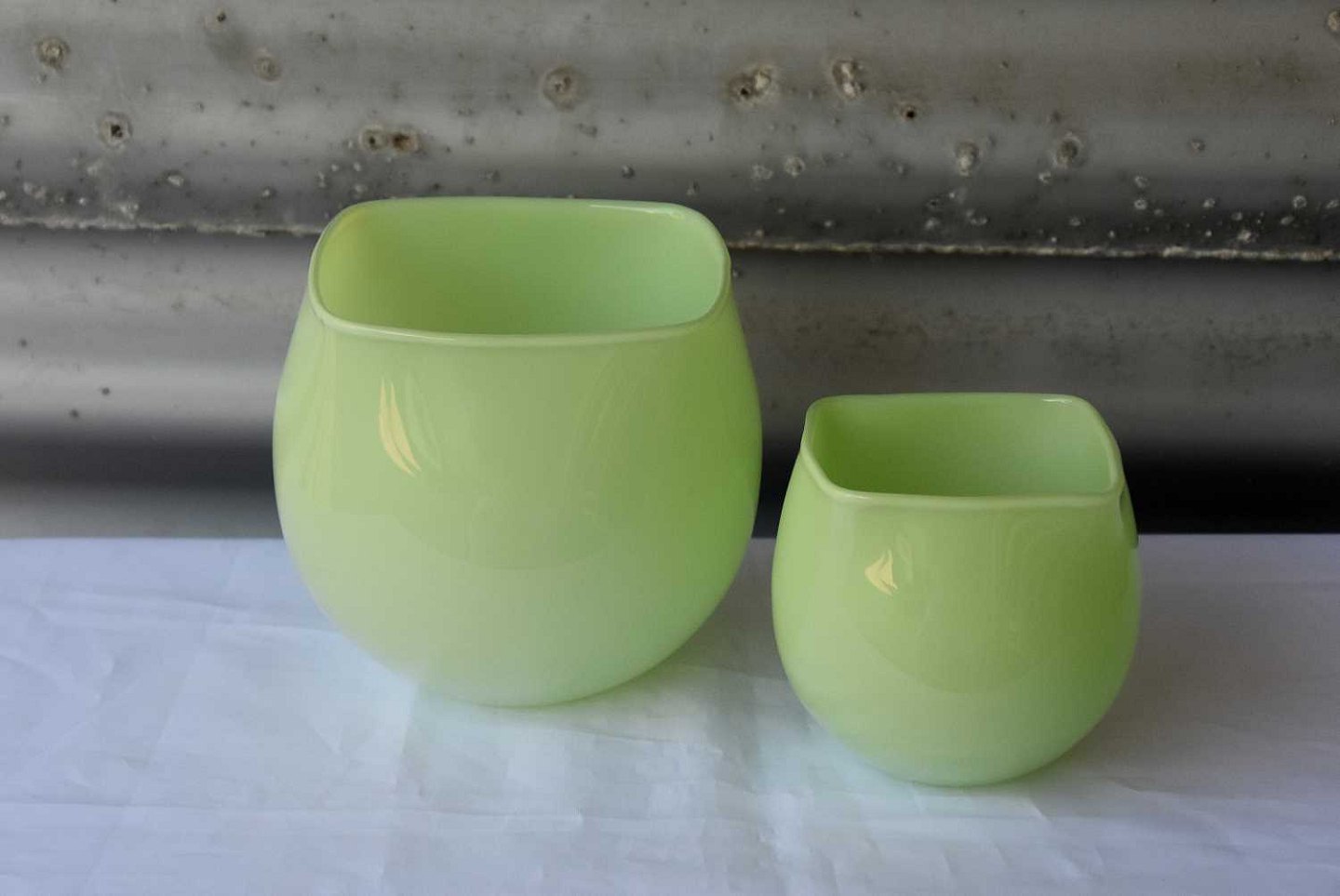 Quadro Urtepotteskjulere med tøndeformet glat korpus og 4-kantet rand. Mintfarvet glas med klart overfang. urtepotter fra serien Quadro