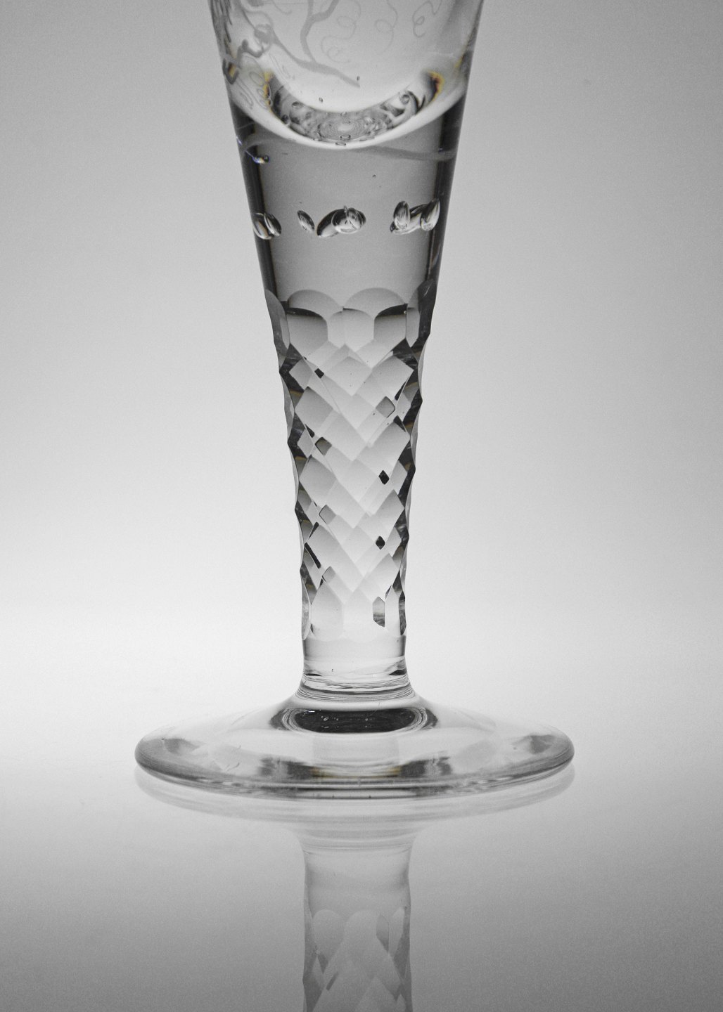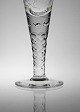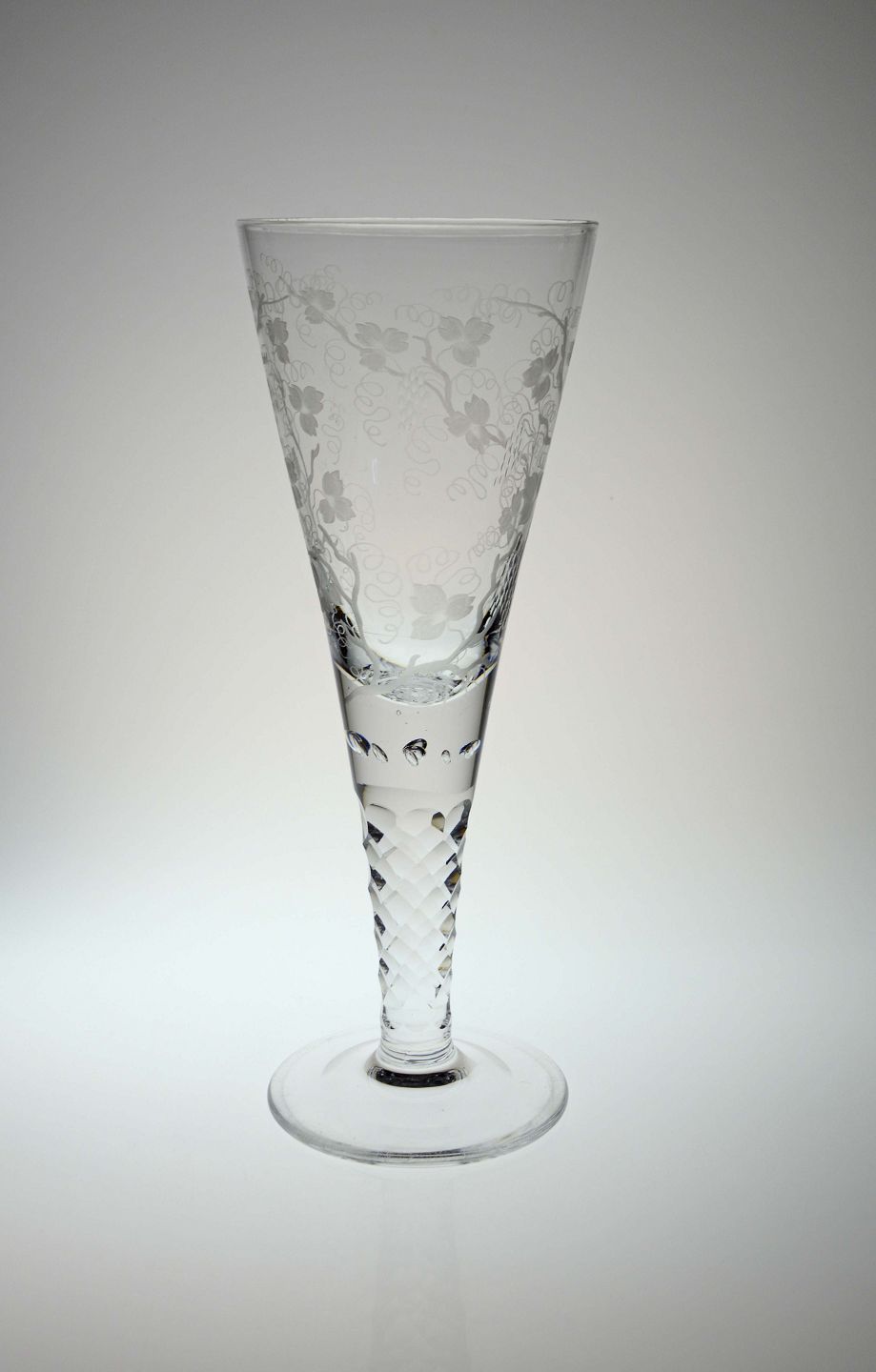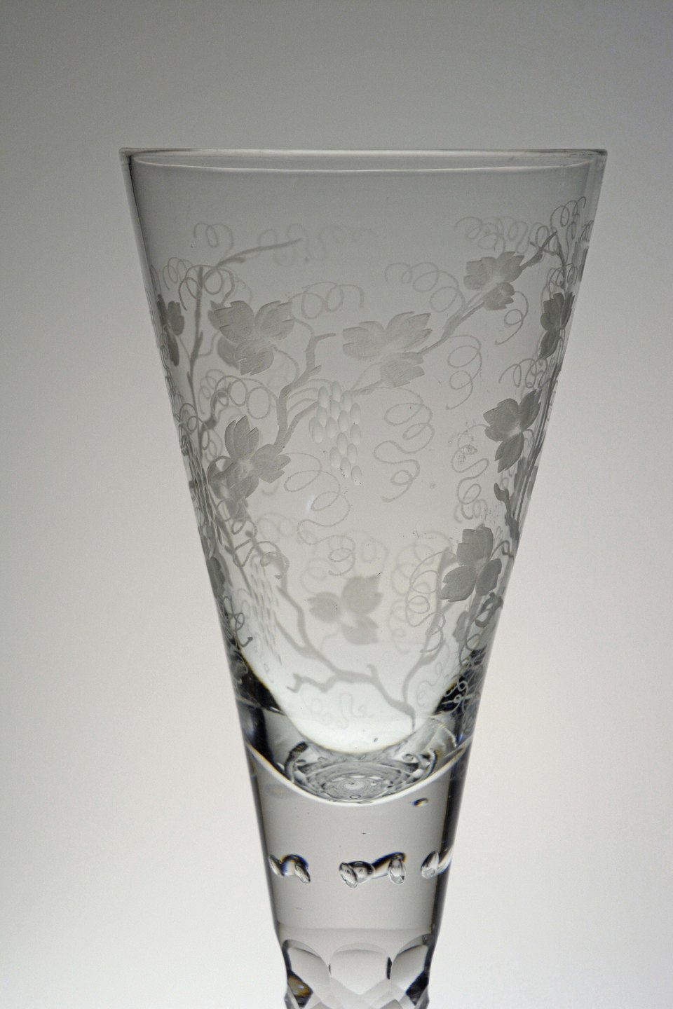 Pokalglas med olivslebne stilk og vindrueranker og druer på kumme Glaset er kugleslebet og med luftbobler under stilk. Muligvis Kastrup men formentlig Holmegaard.