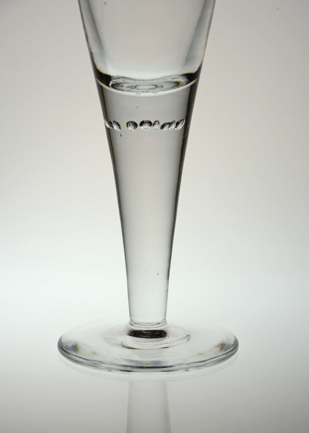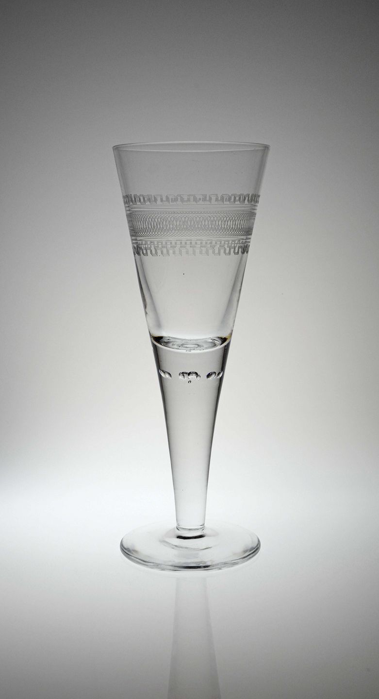 Pokalglas med guillocherede bort, formentlig fra Holmegaard, glatte bund og bobler under kumme.