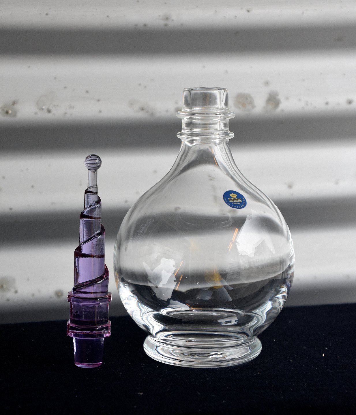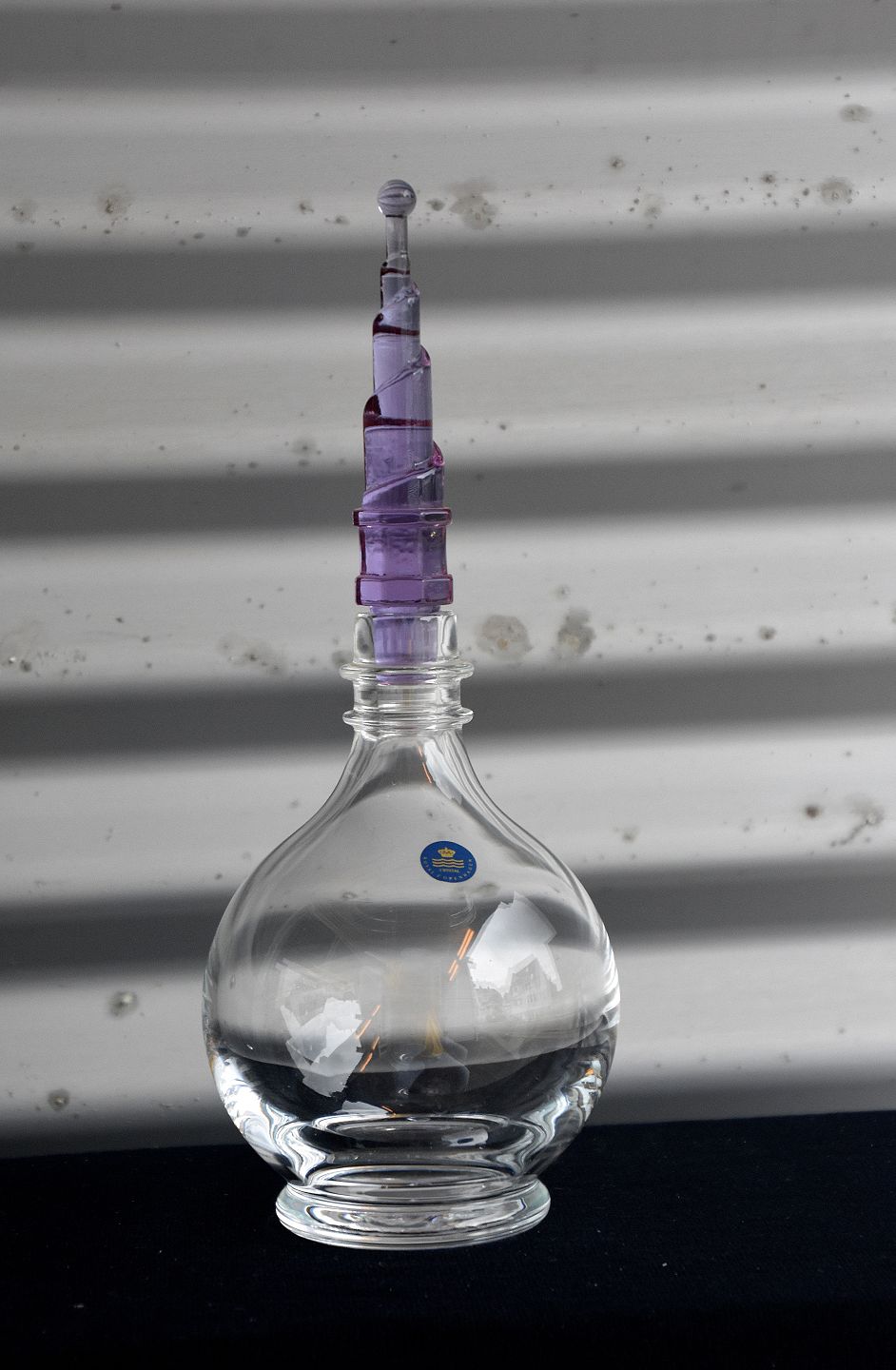 Karaffel i serien Byens Tårne, "Vor frelser Kirke". Kugleformet karaffel med prop af "Vor Frelser Kirkes" spir, proppen er svagt lilla.
