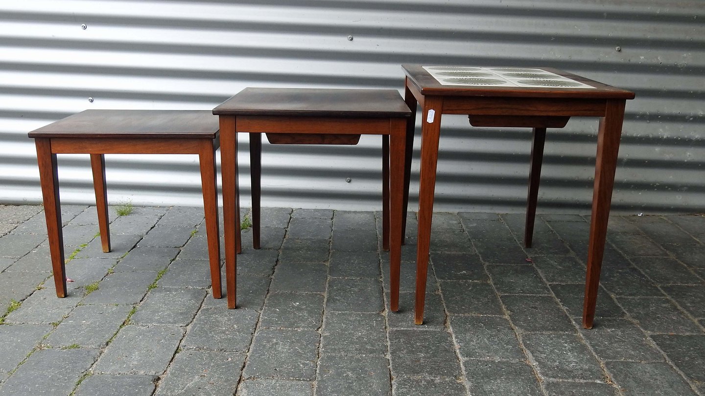 Et sæt indskudsborde i palisander med Royal Copenhagen kakler på øverste topplade