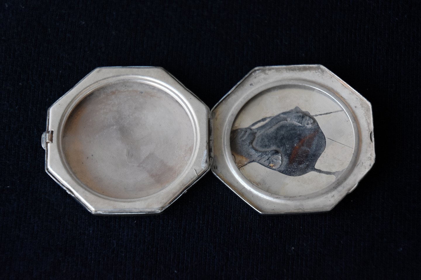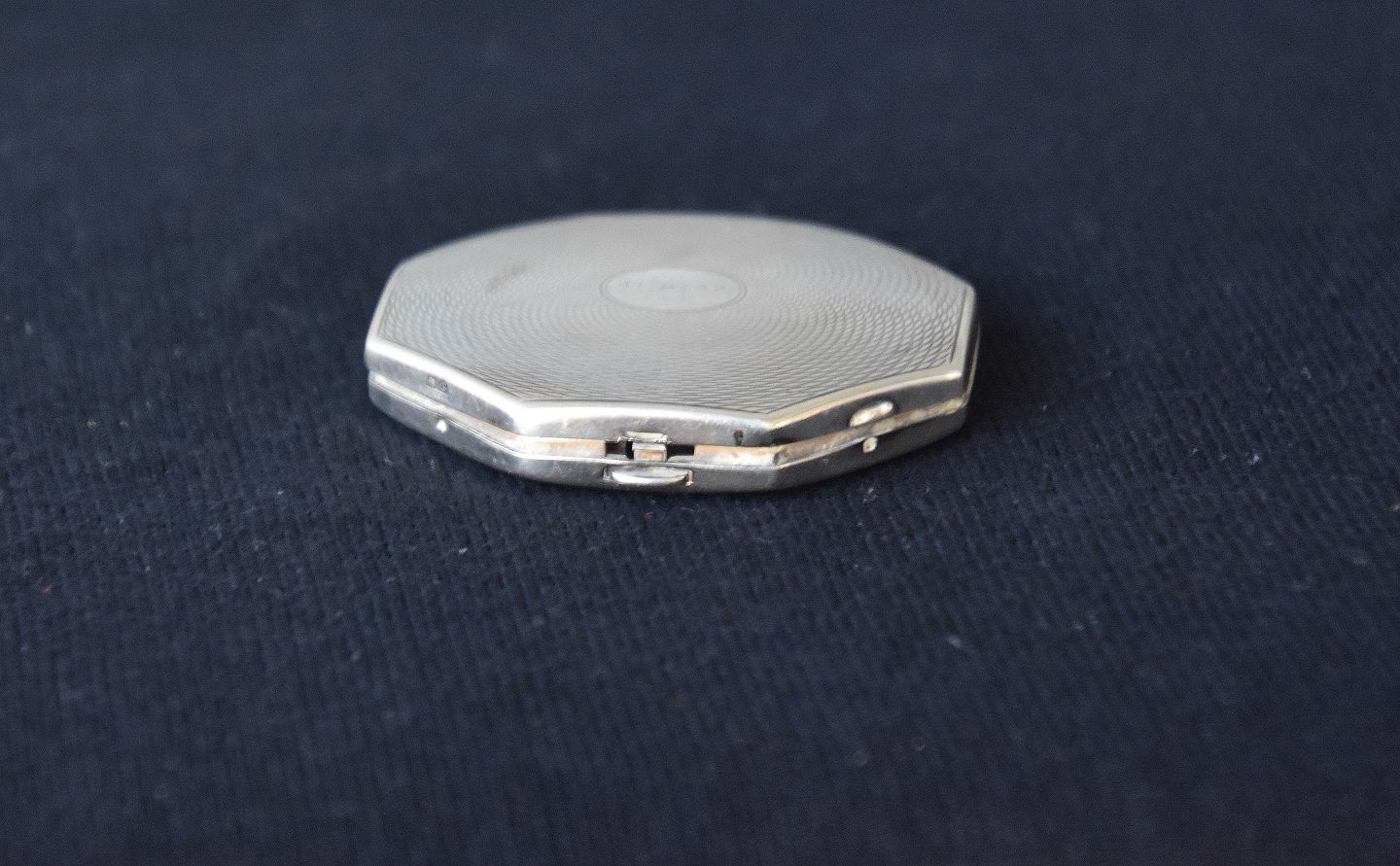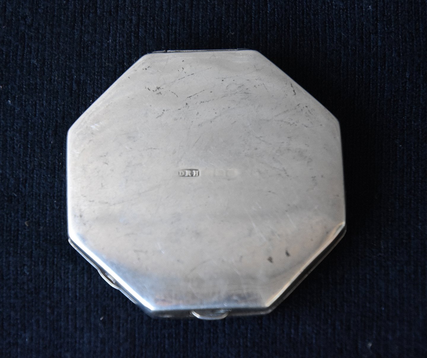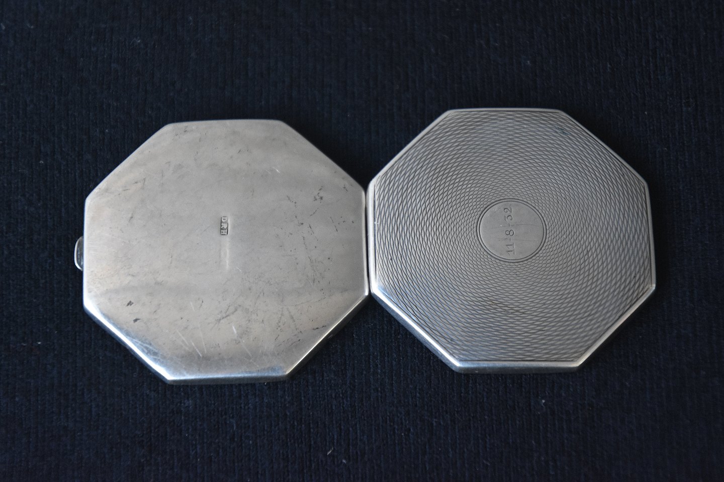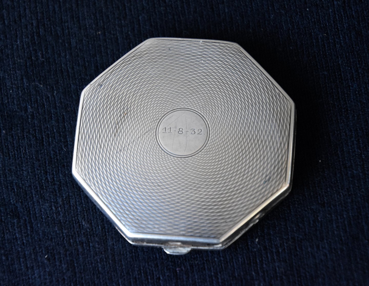 Pudderdåse i sølv, dåse er 8-kantet og med ciselering, indgraveret 11-8-32