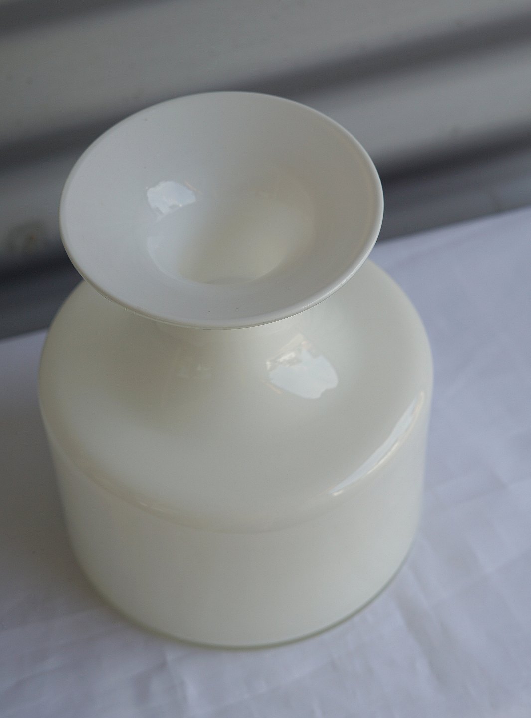 Hvid Carnaby vase. Vasen er blæst i opal med farvet mellemlag og klart glas overfang. Vaser er produceret på Fyens Glasværk for Holmegaard Glasværk.