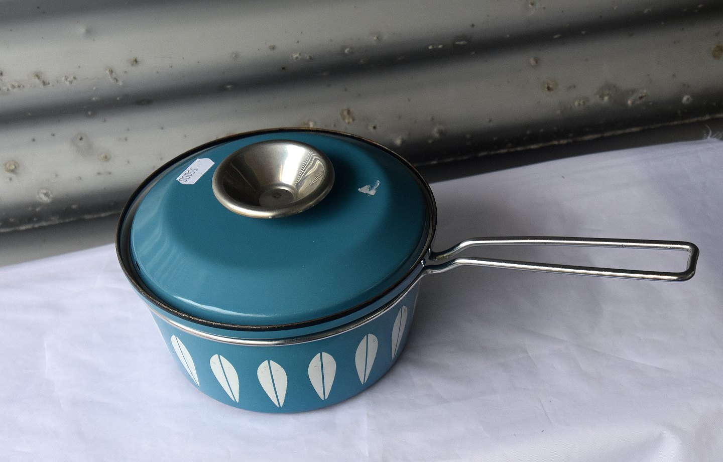 Kasserolle, blå emaljeret med hvide blade, låget er også blåt. Kasserollen er emaljeret