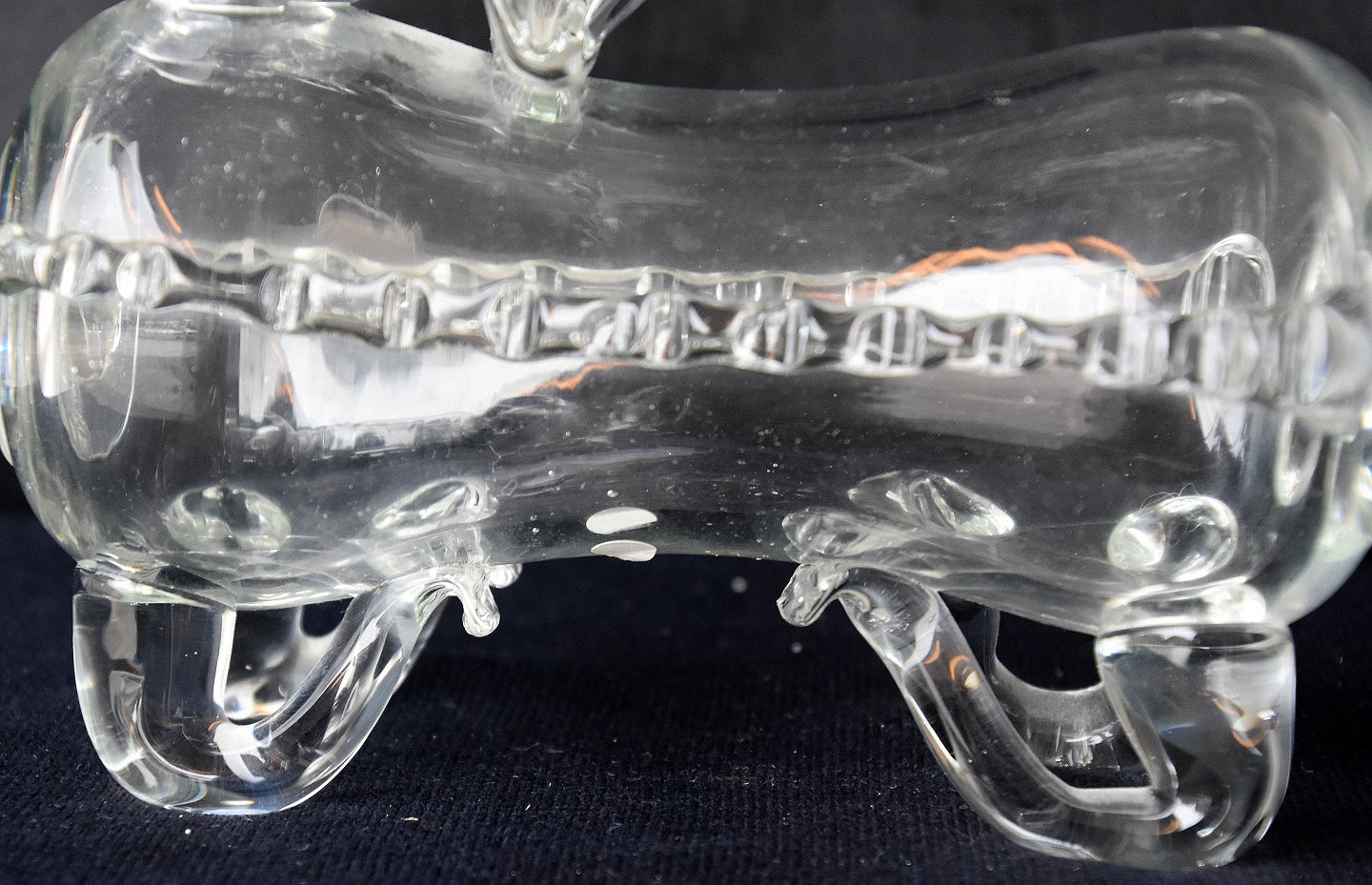 Snapsehund glas, med påsat hale som hank og påsatte ører, både hank og ører er af klart glas, glas med blålig tone