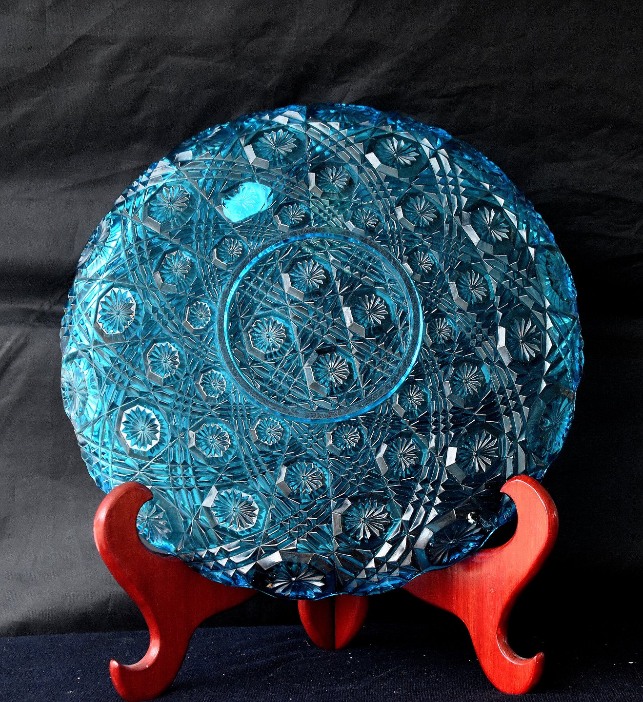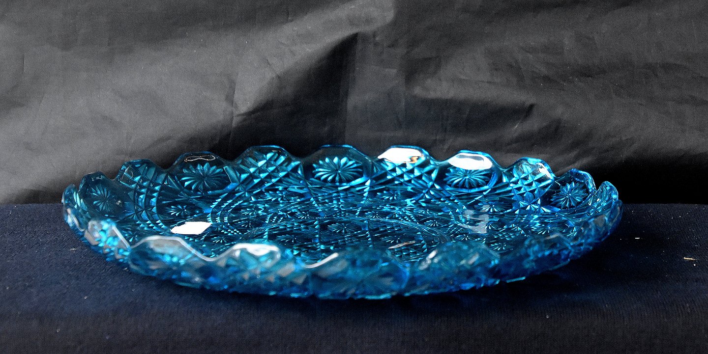 Fad i presset glas, fadet er blåt, med efterligning af skærslibning