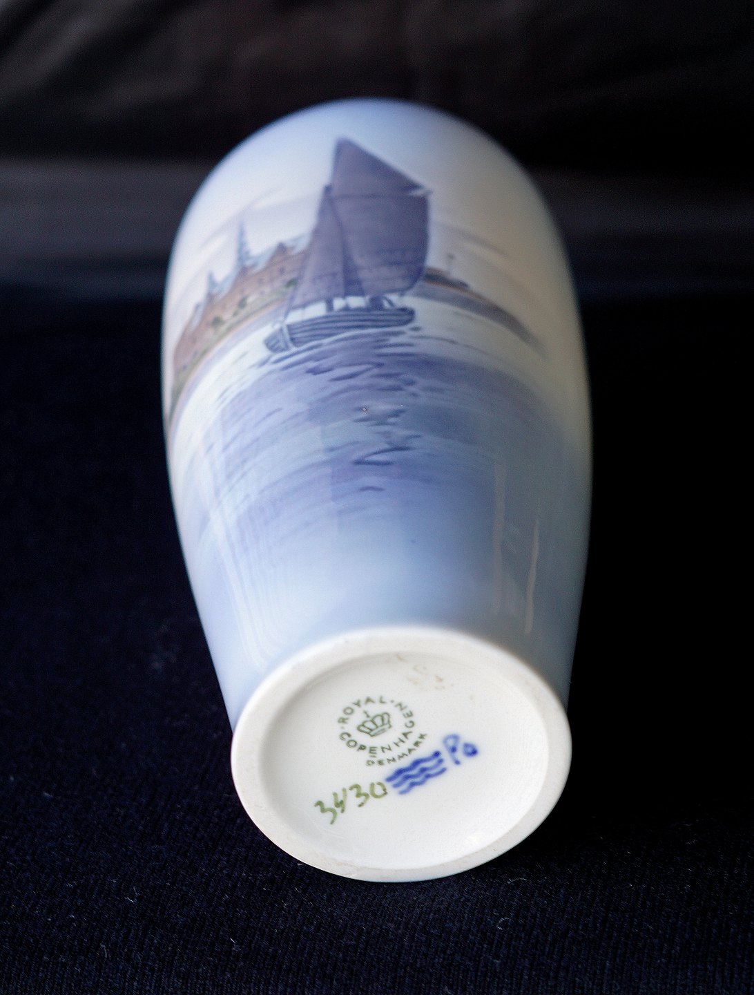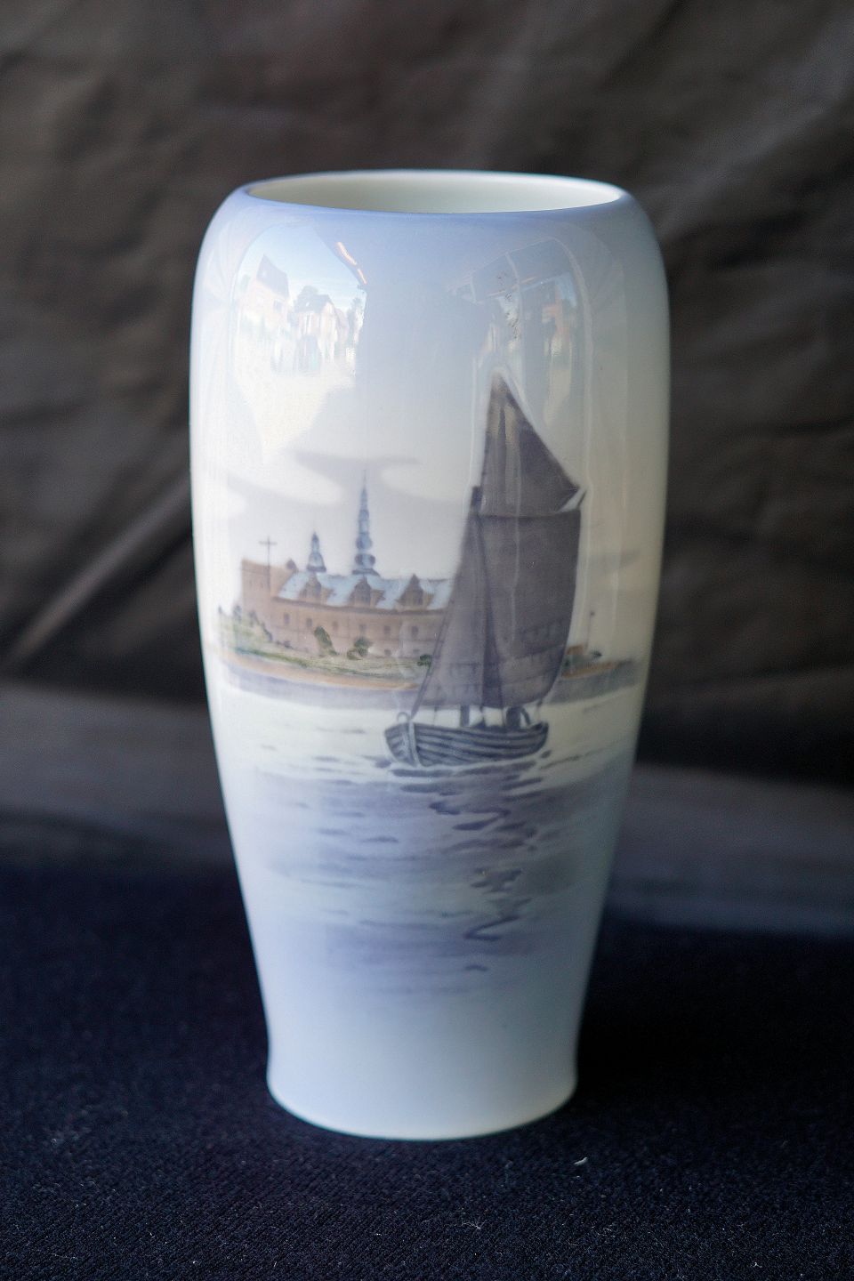 Royal Copenhagen, Vase 3430. Dekoration er Sejlskib med Kronborg Slot i baggrunden, på bagsiden, af vasen, er der 2 måger