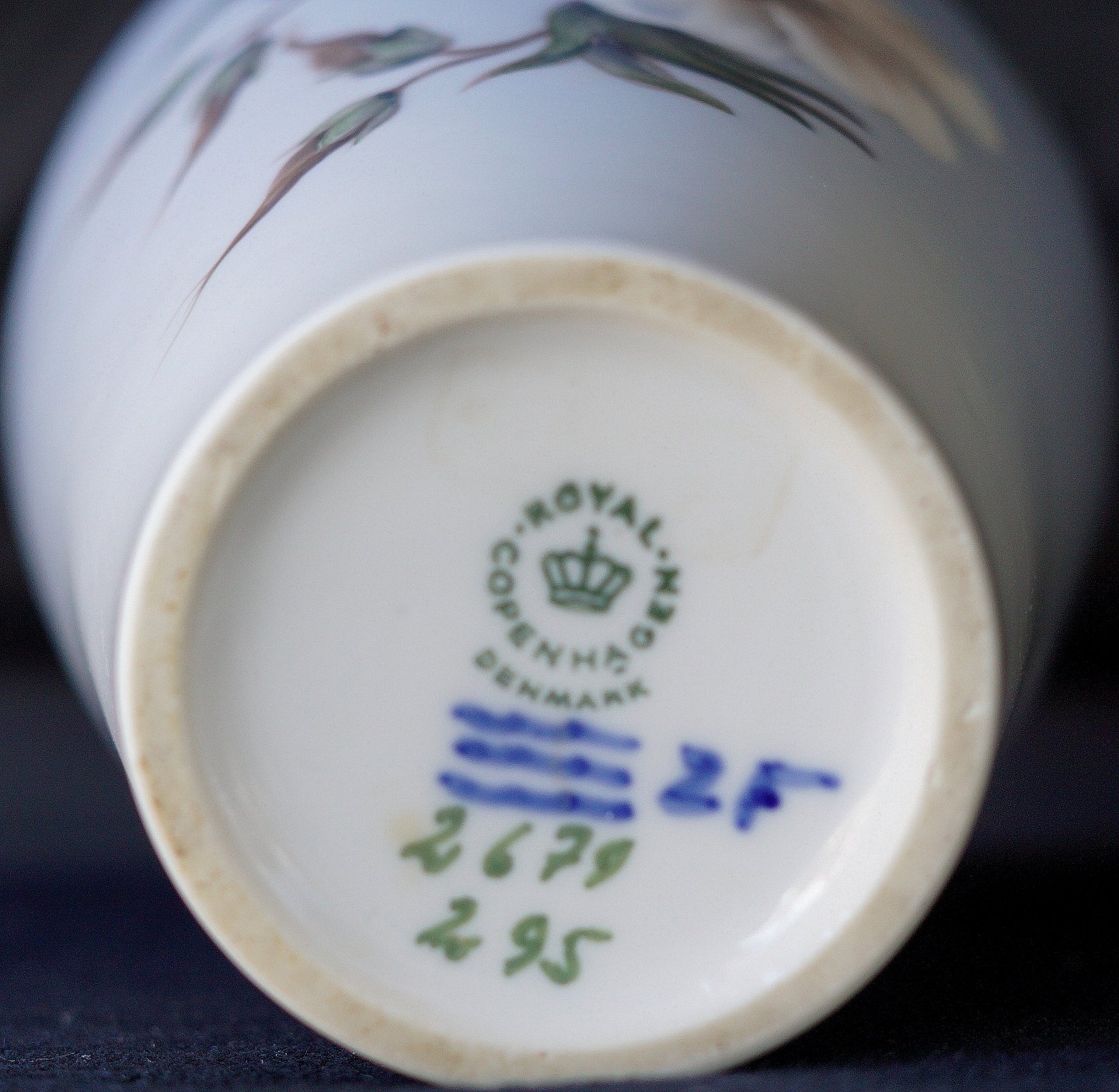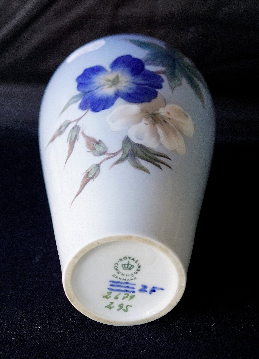 Royal Copenhagen, vase 2679/295. Dekoration på vasen er blå og hvide snerleblomster, 2. sortering