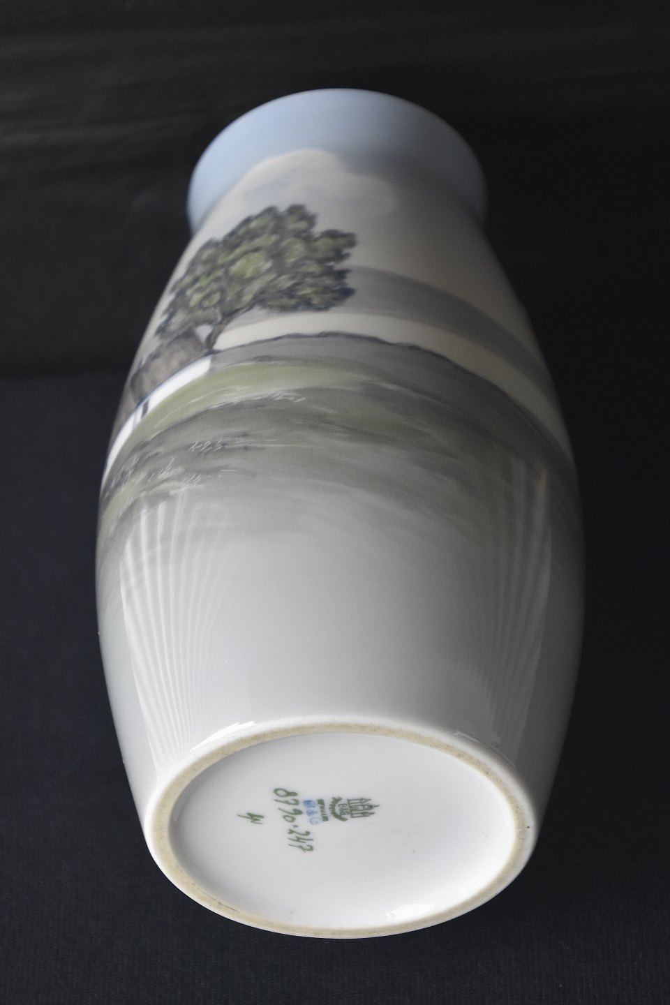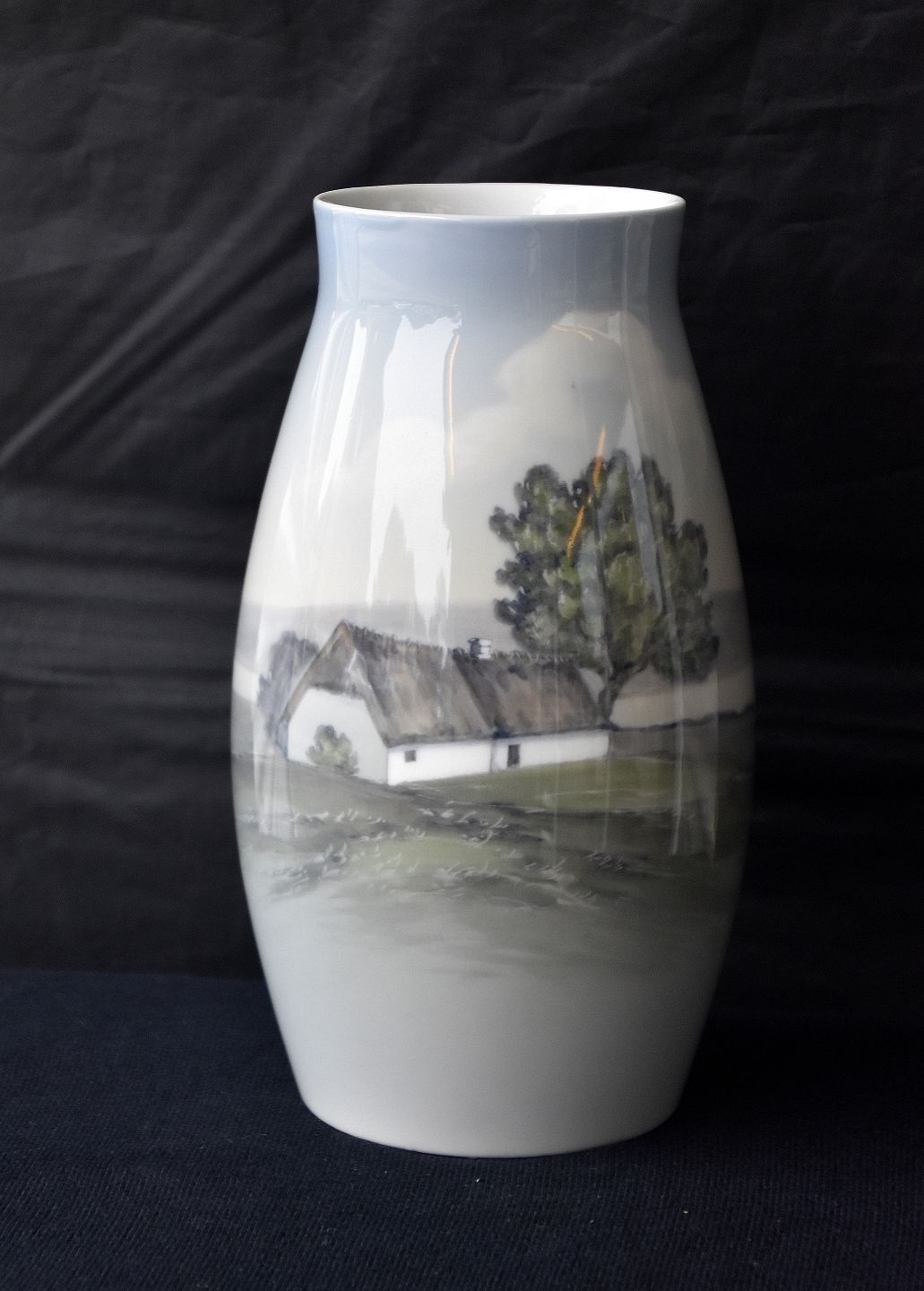 Bing & Grøndahl, vase 8790-247, 1. sortering. Stråtækt bondehus med et stort træ med stor grøn krone