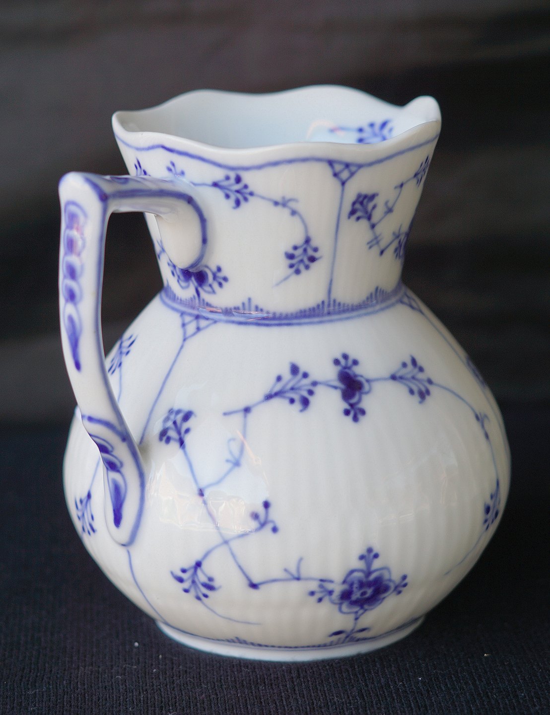 Royal Copenhagen, RC, Den Kongelige Porcelænsfabrik, KGL., kande, musselmalet, riflet, porcelæn