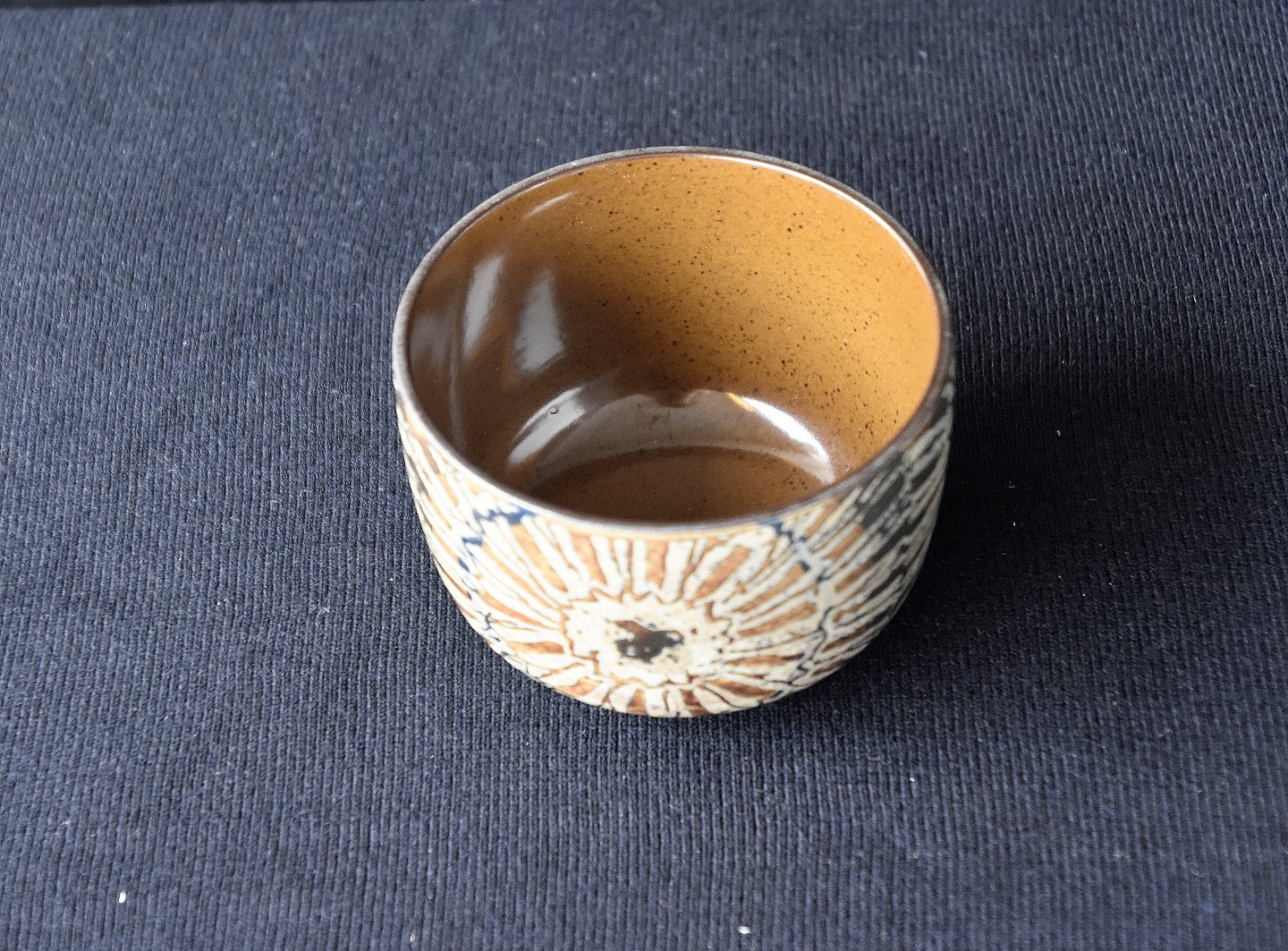 Royal Copenhagen, lille bæger 870/3734, kunstfajance, Bægeret er dekoreret med brunligt mønster udvendig og indvendig helt lysebrunt