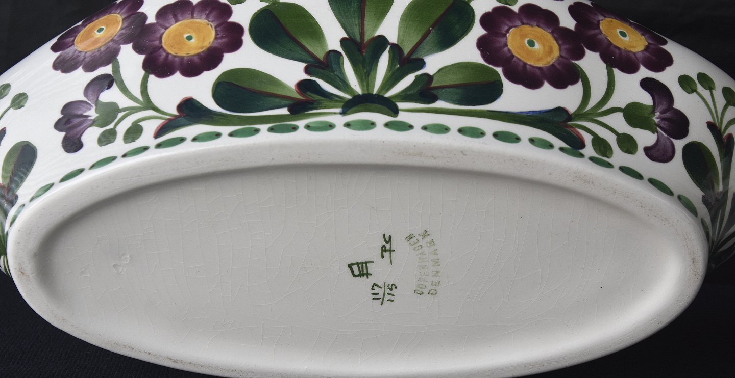 Den Kongelige Porcelænsfabrik, KGL., Royal Copenhagen, RC, Aluminia, jardiniere, lilla, gule, blomster, grønne blade