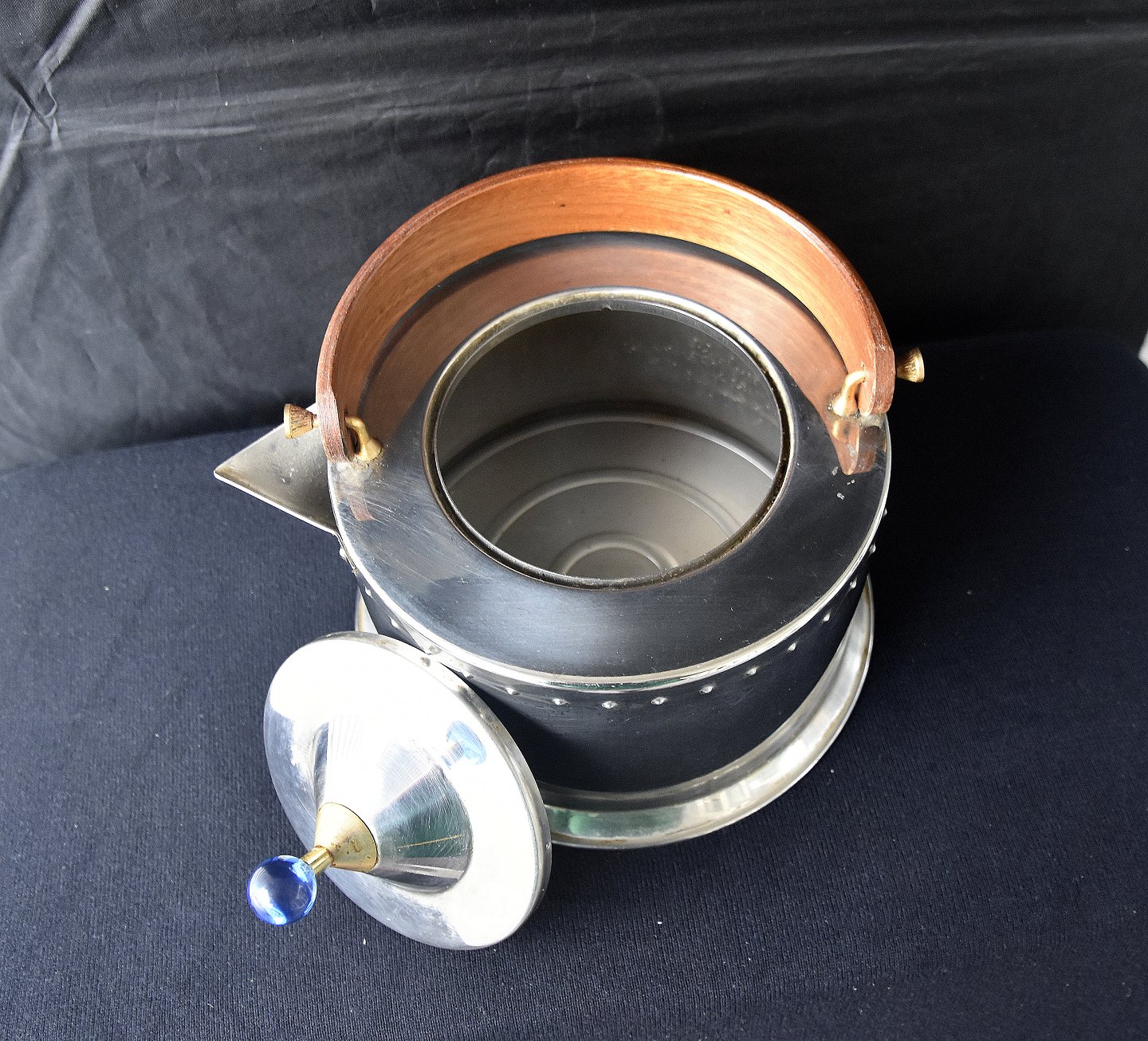 Bodum tekande med teaktræshåndtag. Kanden er lavet af blankpoleret stål, INOX 18/10. Hank er af teaktræ og der sidder en lille blå kugle på toppen af låget. Kanden er nittet sammen og de skruer der er brugt er af messing. made in Italy