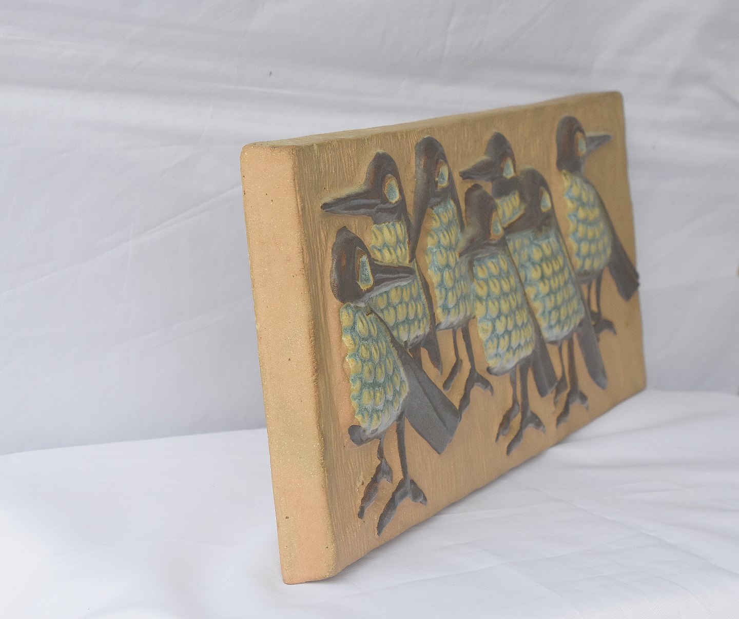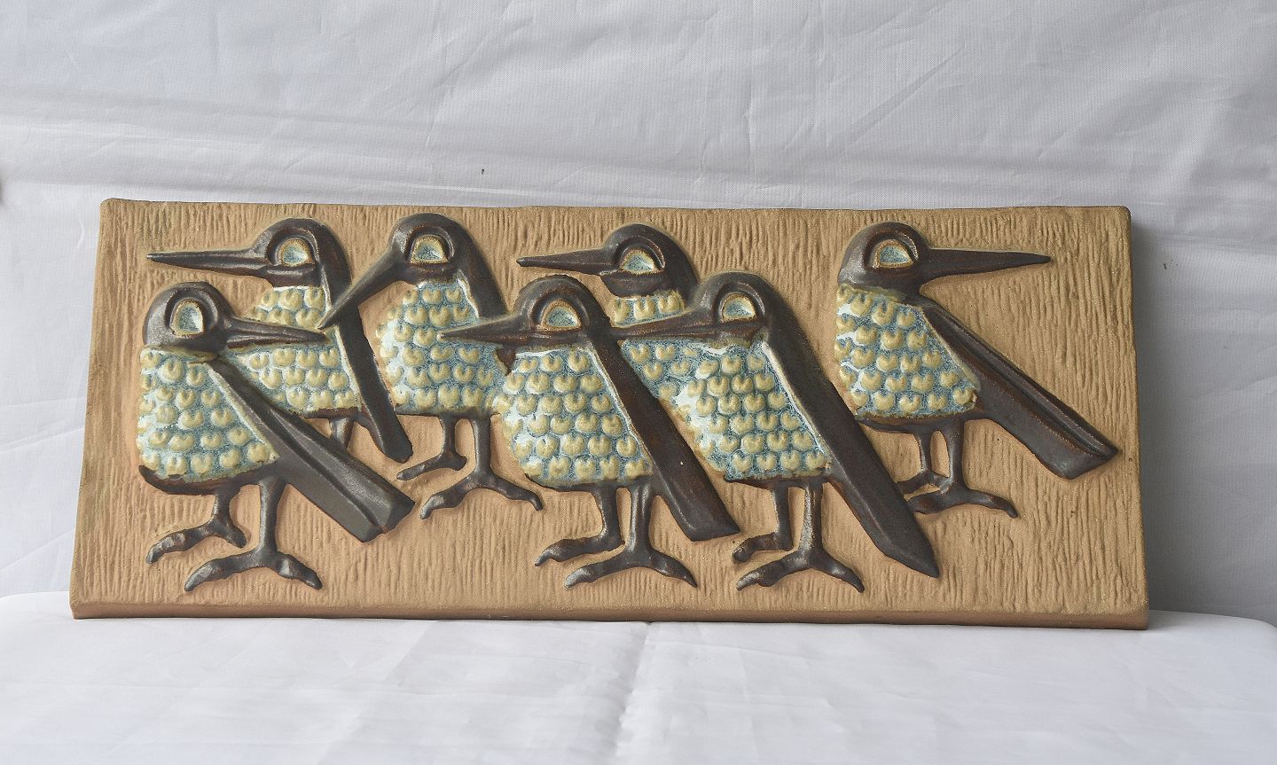 Michael Andersen, Bornholmsk Keramik relief (6237) med 7 blå fugle, relieffet er keramik.