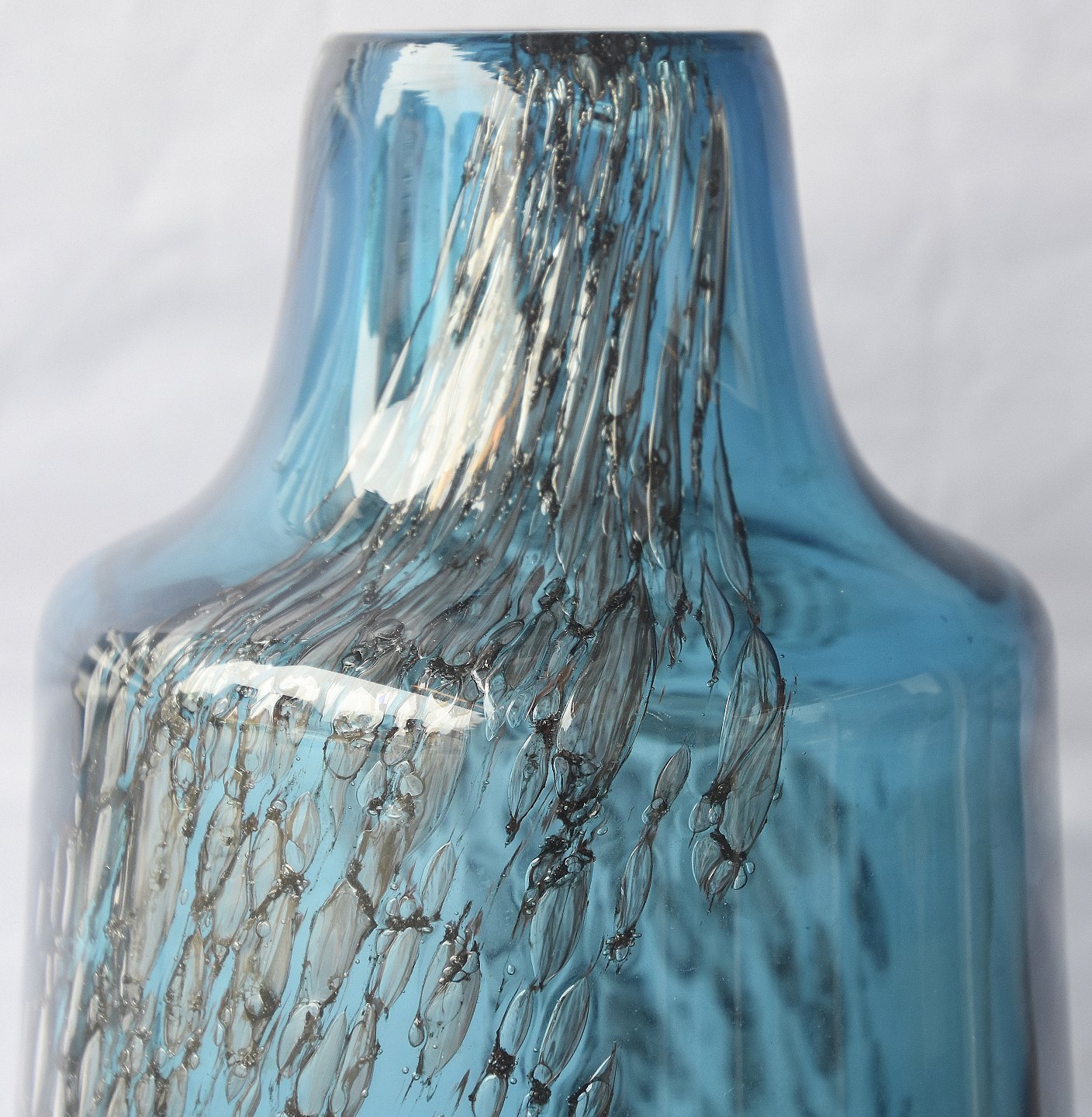 Blå glasvase med luftbobler der ligner sølv