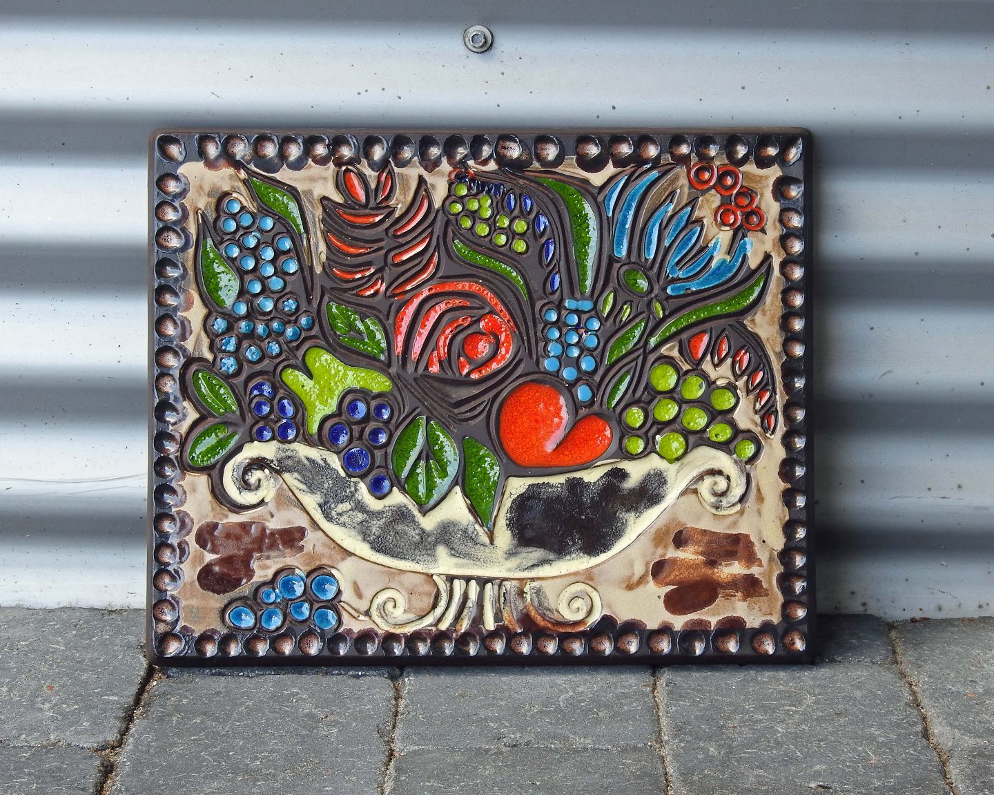 Relief i keramik med motiv af frugter og blomster i fad