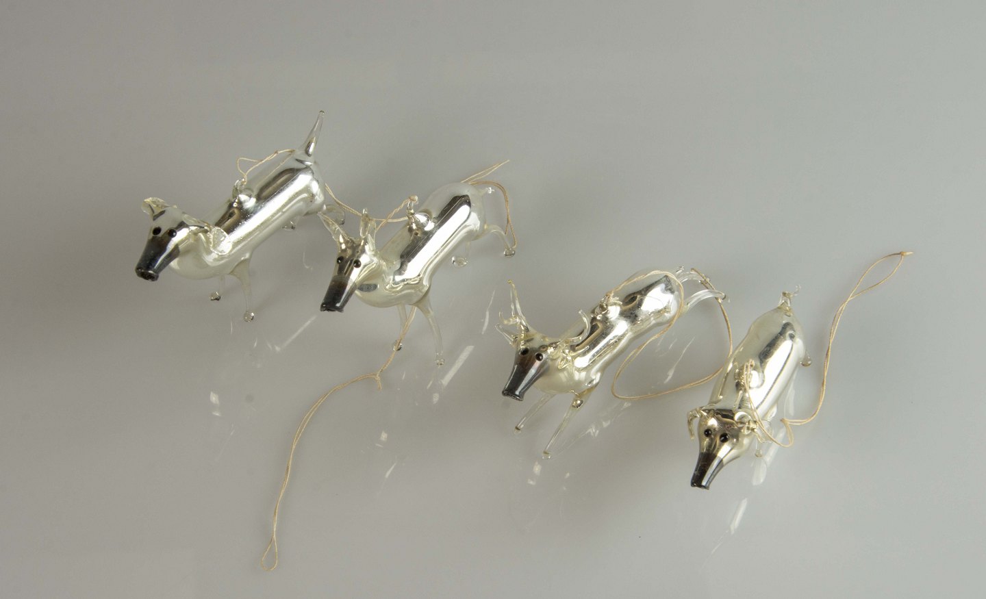 Fire gamle juleophæng i glas med motiv af gris, to hunde og et rensdyr