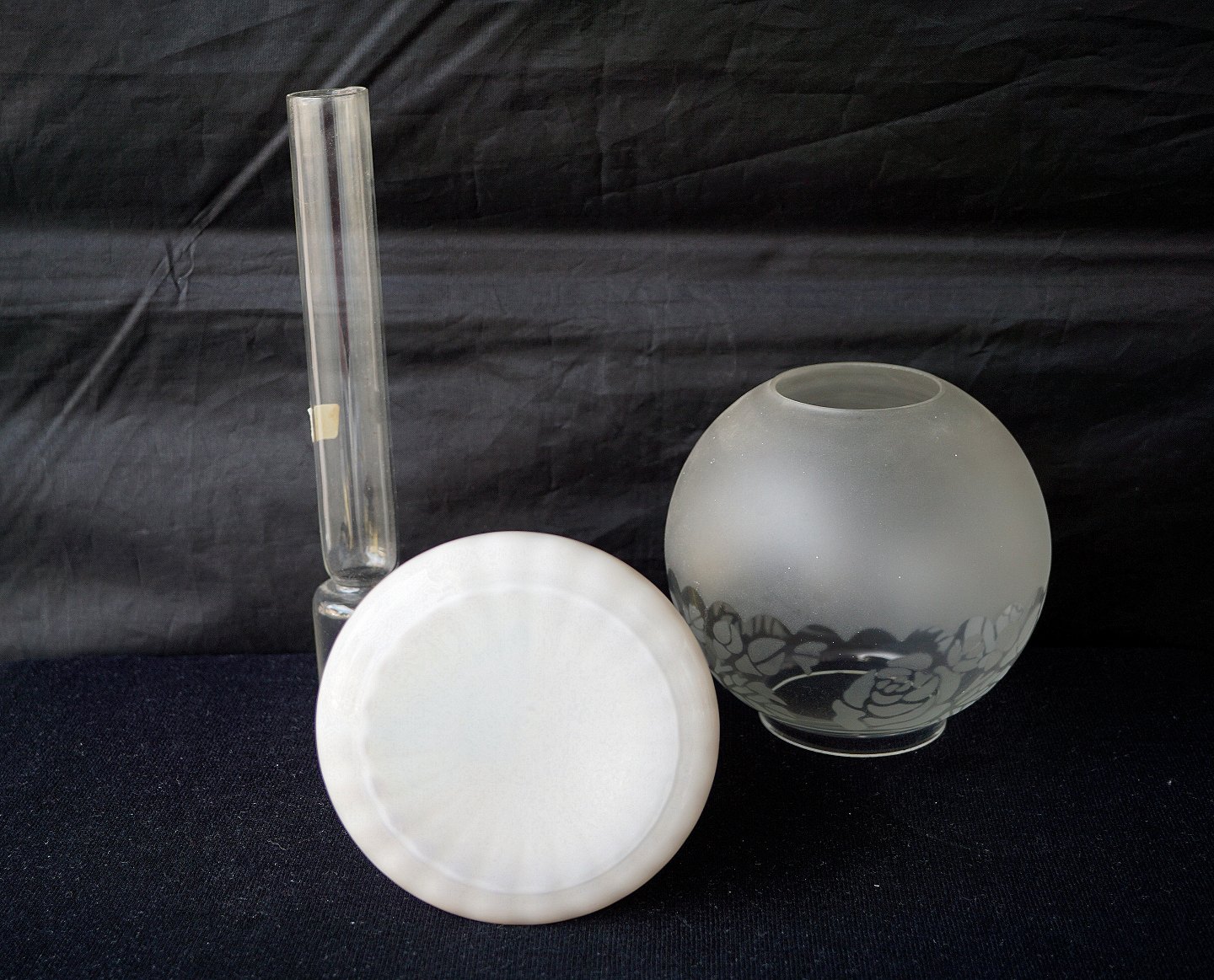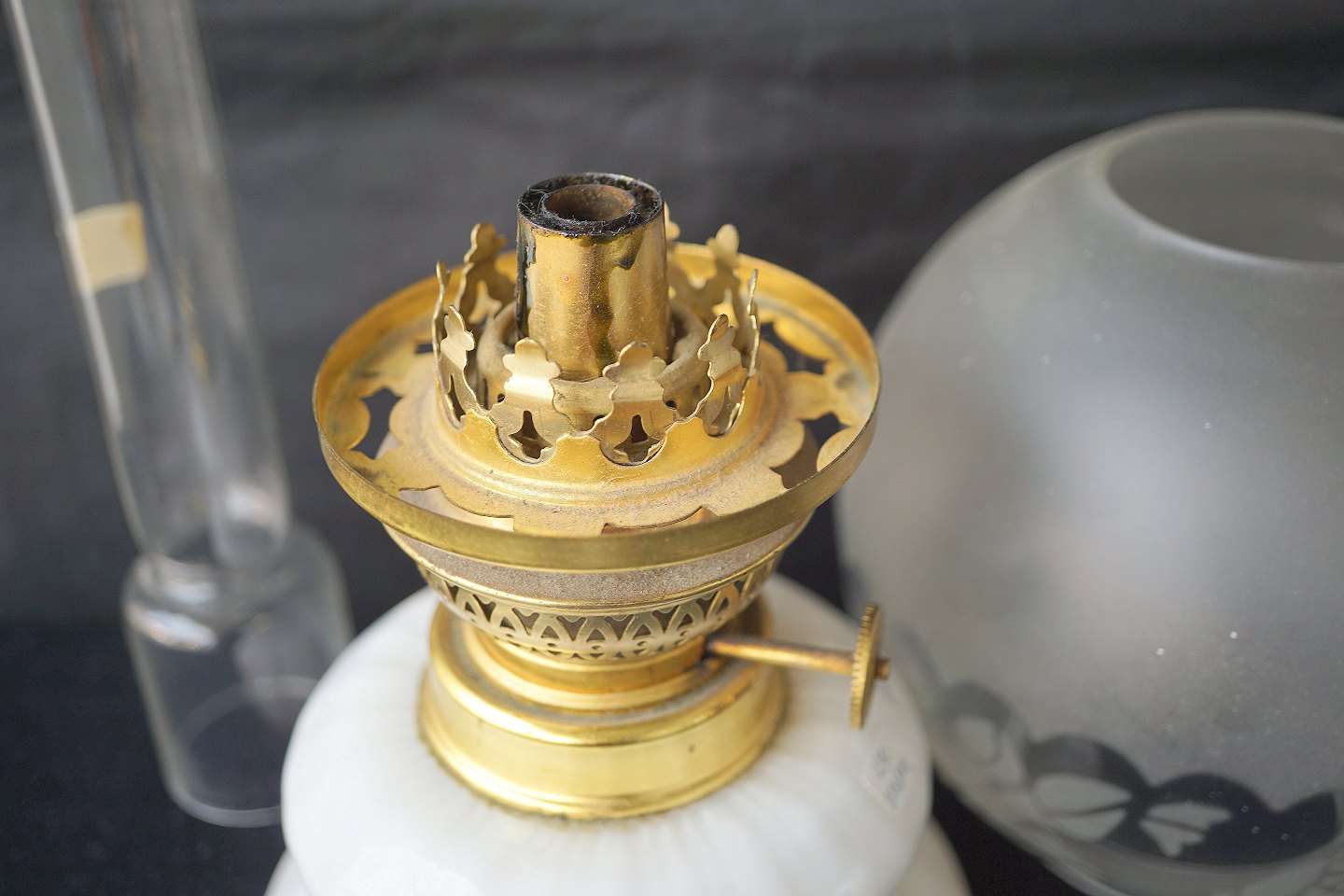 Dagmar olielampe, foden er af hvidt opalglas. Produceret både som olielampe og som el lampe. Inderste glasrør kan variere i højde.