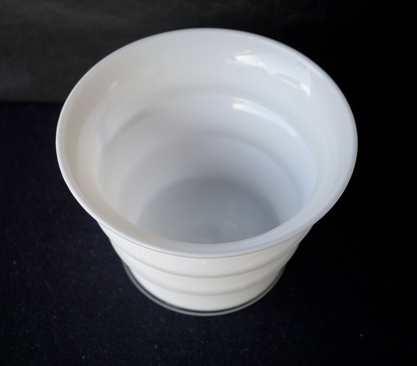 Karen Blixen urtepotteskjuler, opalhvidt glas. Formen er konisk, blæst i form med 2 vulster på midten