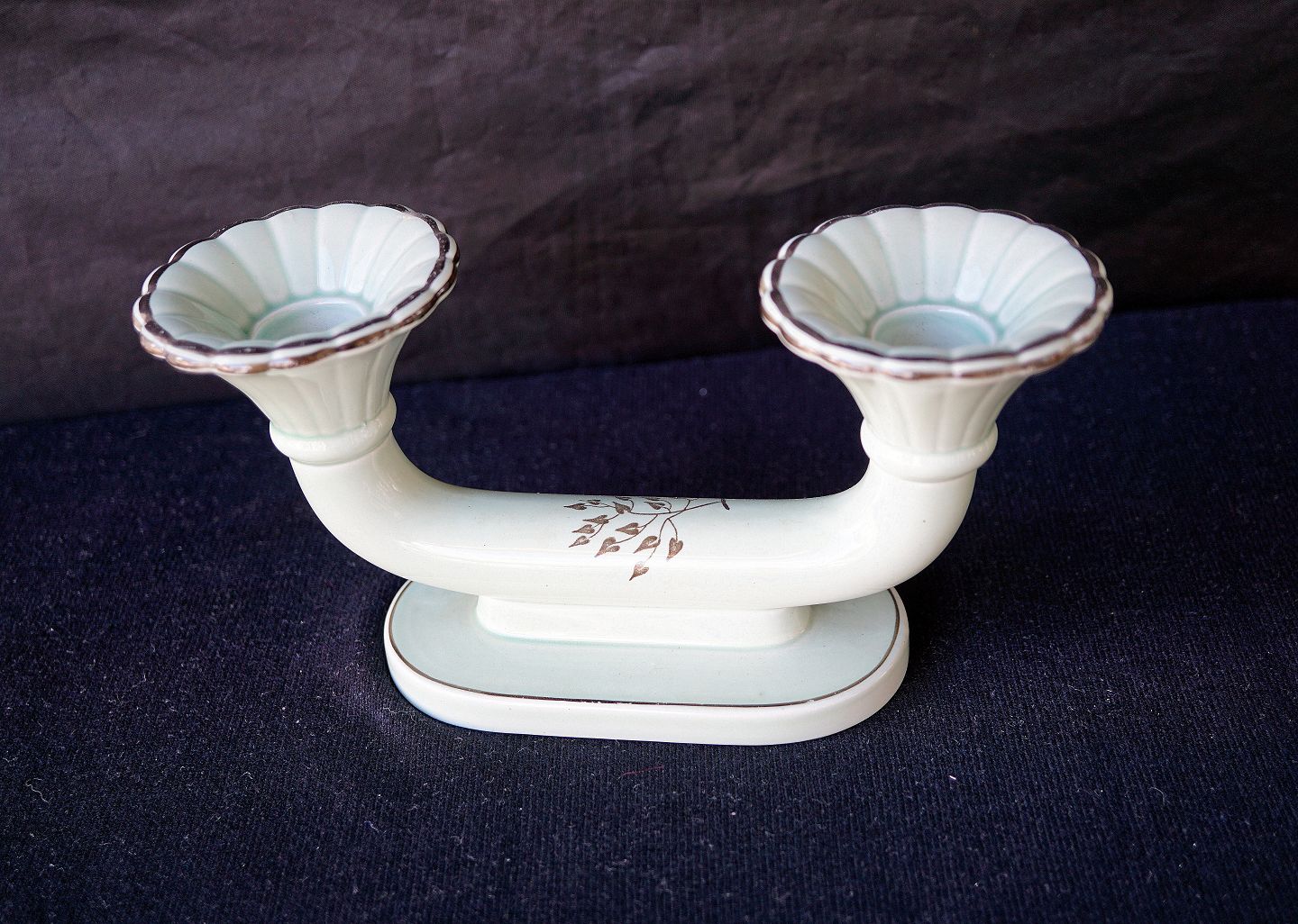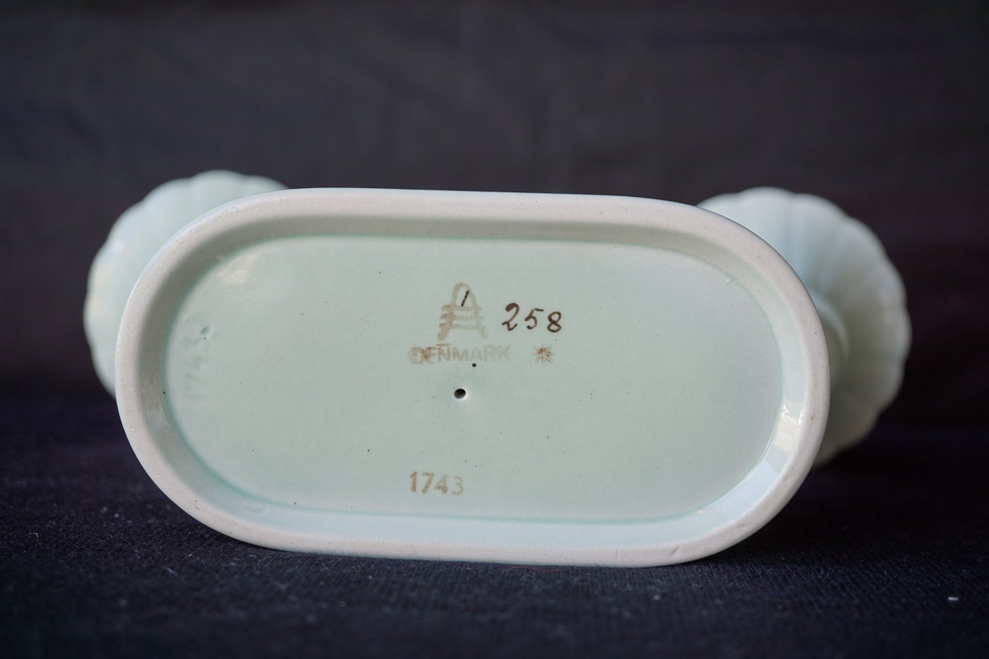 Aluminia, Denmark. Dobbeltarmet lysegrøn lysestage Saltholm, nr. 258, der er malet mørke blade på midten af lysestagen.
