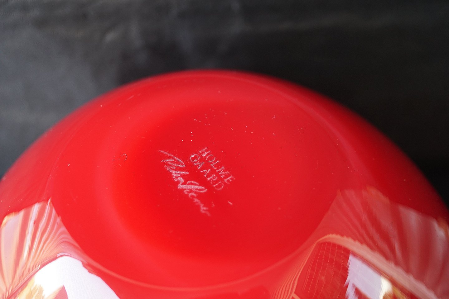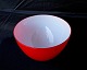 Rød Cocoon skål, opalglas med rødt overfang. Navnet på designer er sandblæst i bund af skål