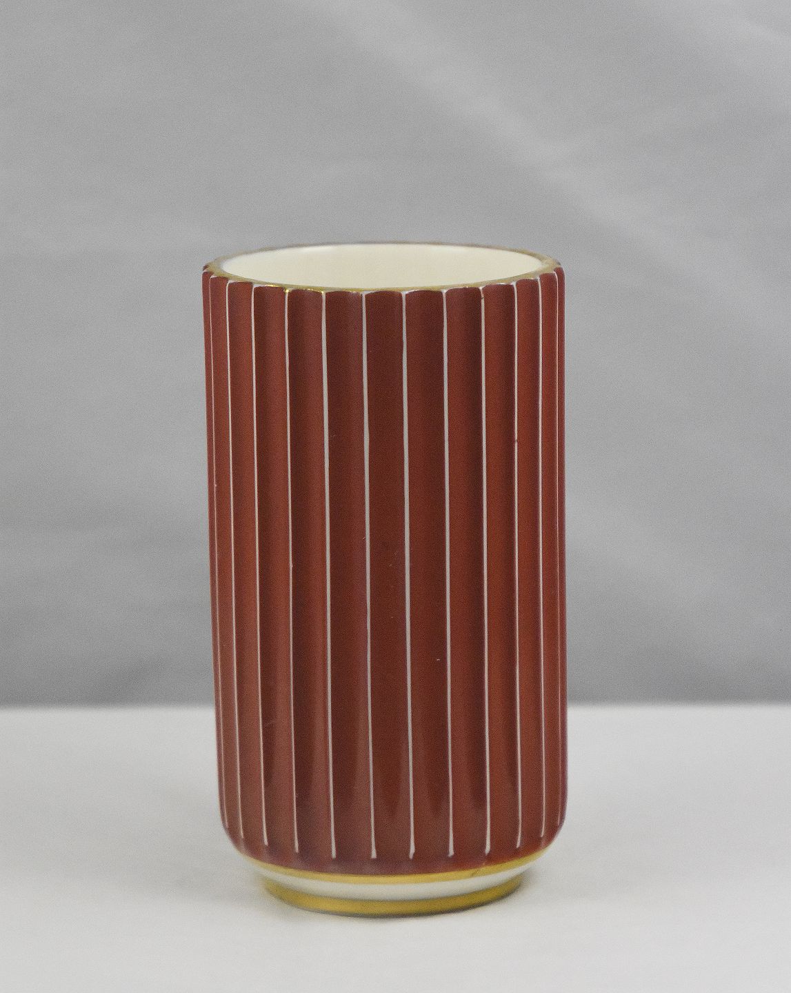 Rød Lyngby vase i porcelæn med riflet korpus og guldkant