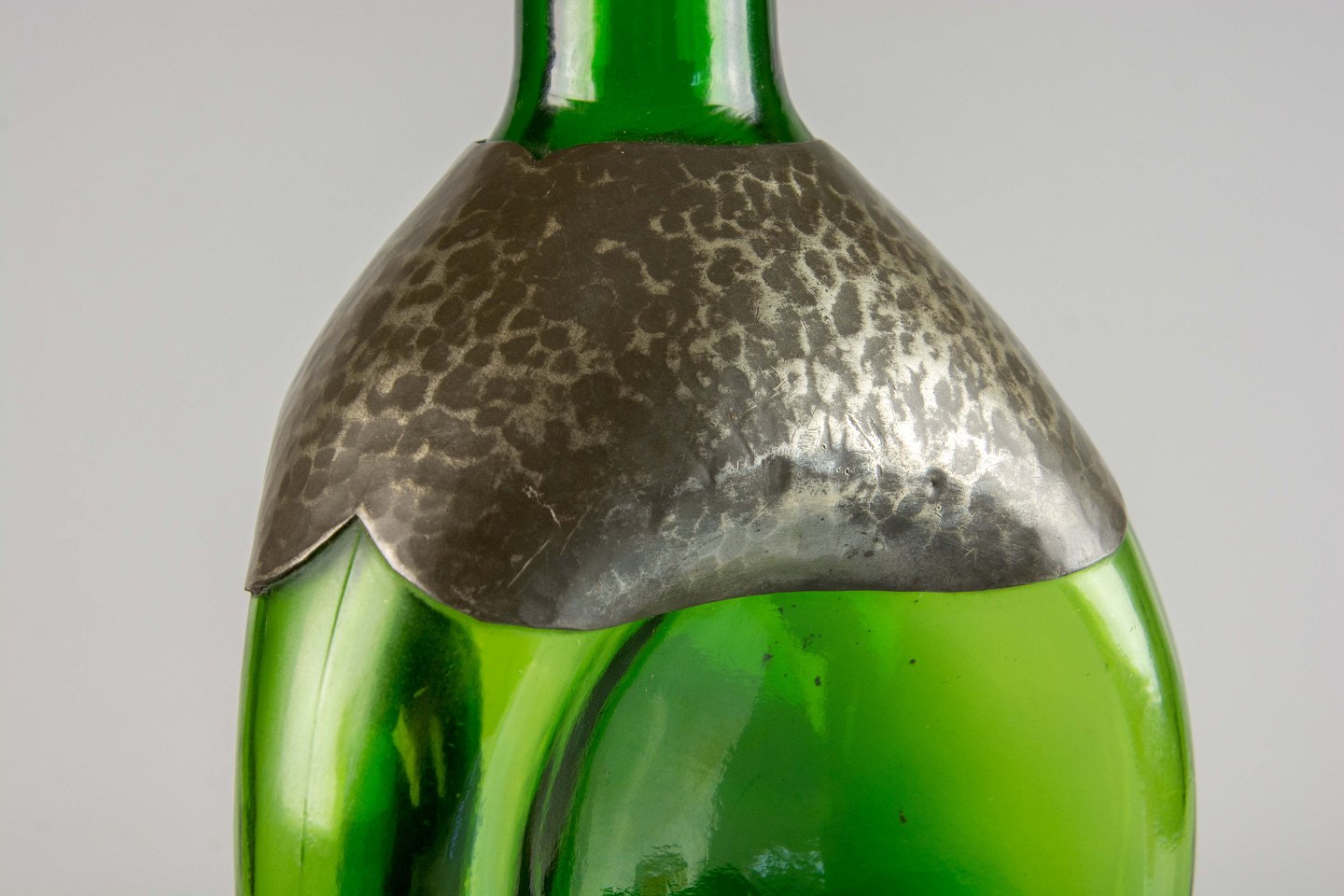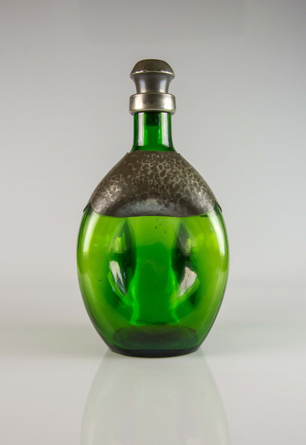 Karaffel i grønt glas med tinbelægning og korkprop beklædt med tin i dansk design
