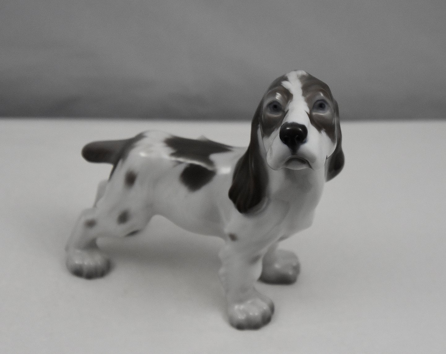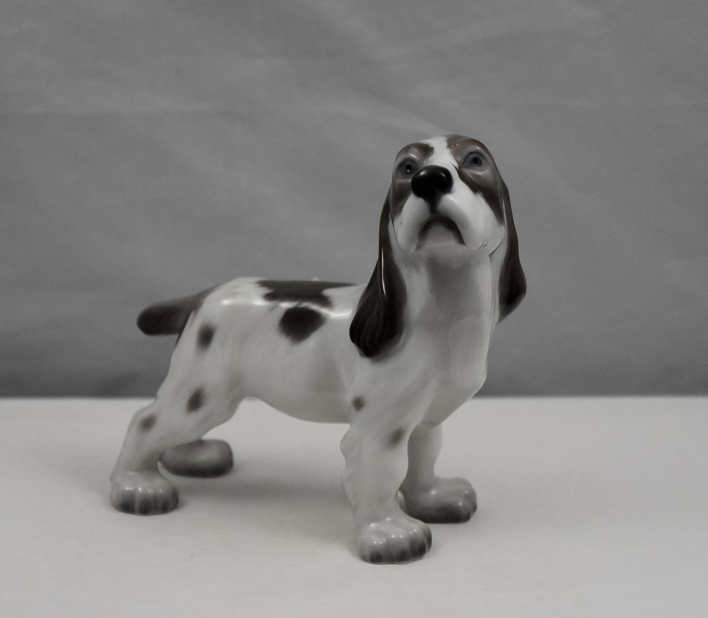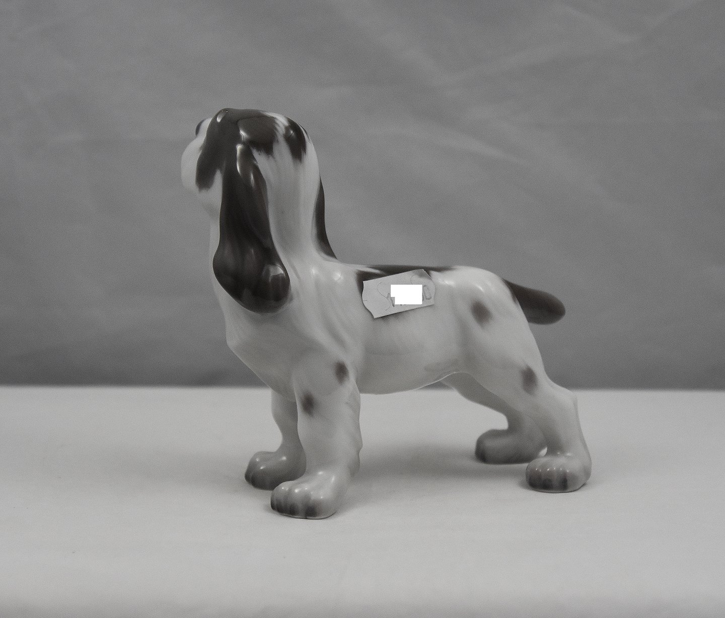 Lyngby figur af Stående Cocker Spaniel med kuperet hale nr.72. Hunden er sort og hvid. Produceret ved Porcelænsfabrikken Danmark