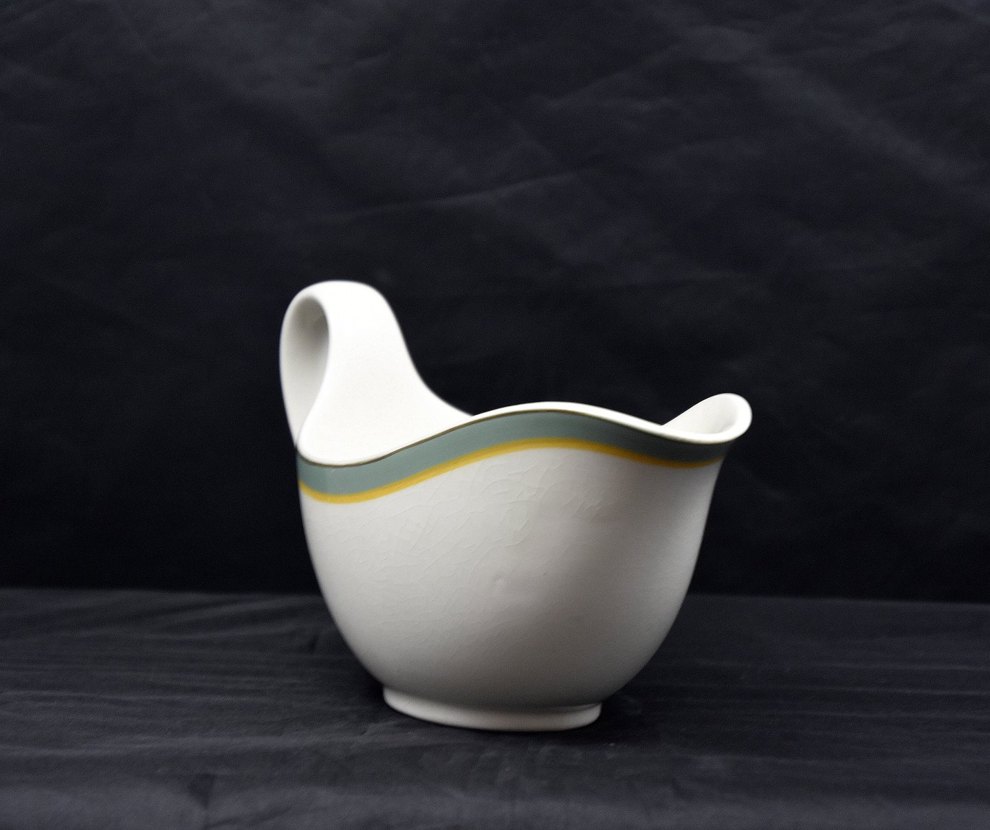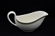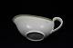 Valdemar sovsekande i kunstfajance. Grundfarve lys creme, kant tynd sort stribe, bred grøn stribe, tynd gul stribe