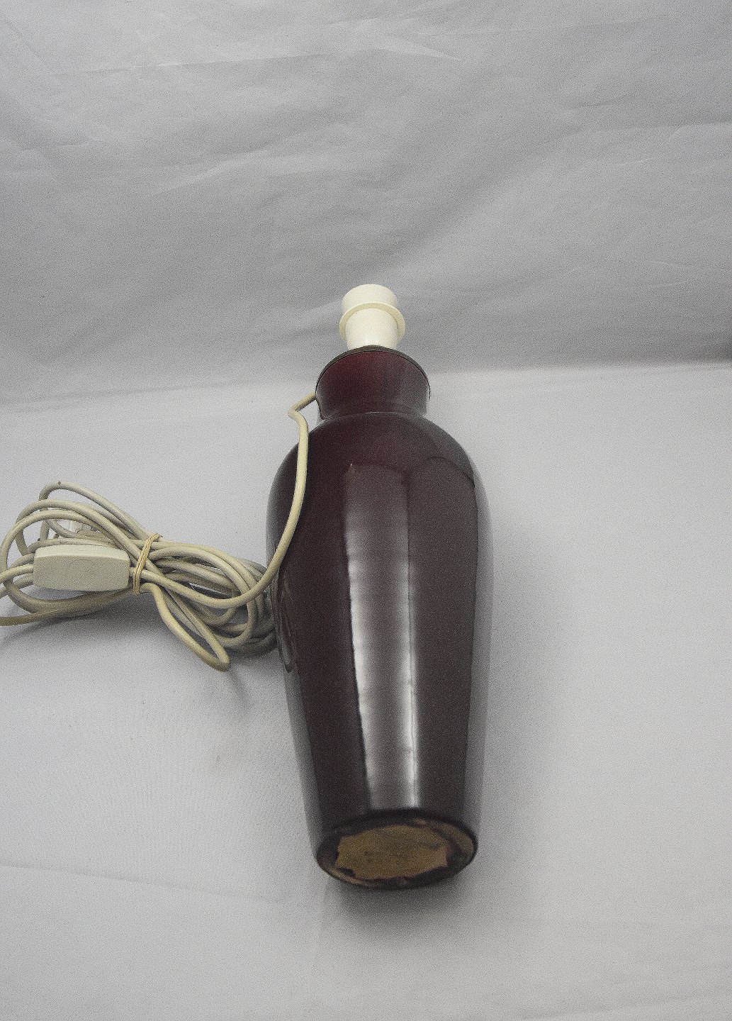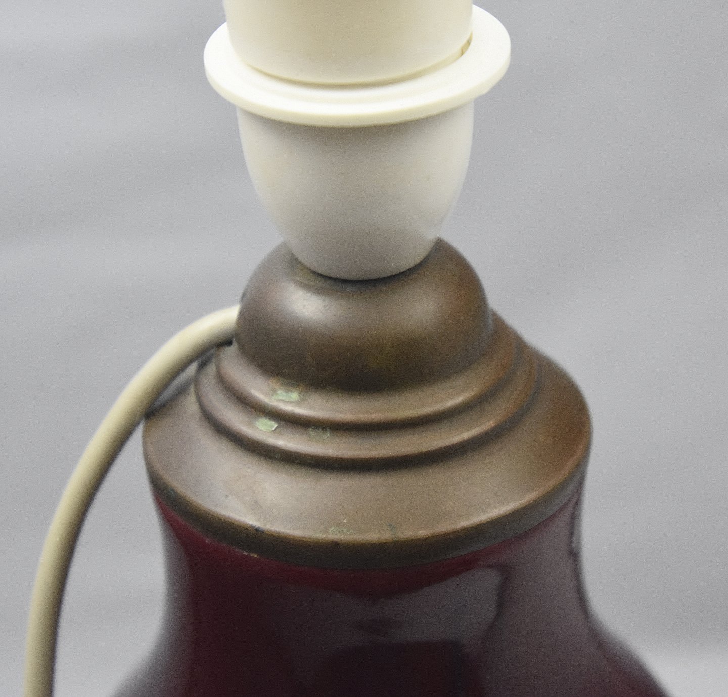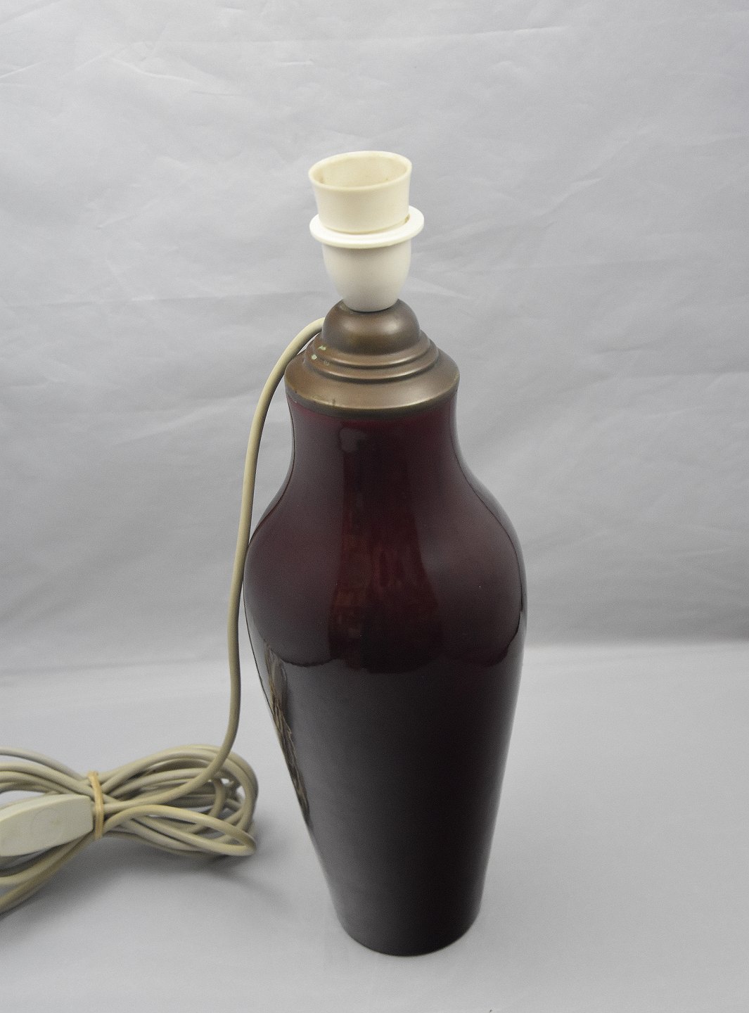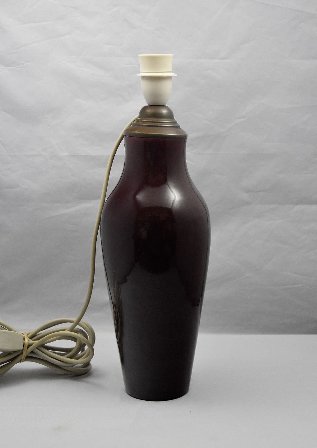 Bordlampe, blodrød keramik bordlampe, lampen har messing krave