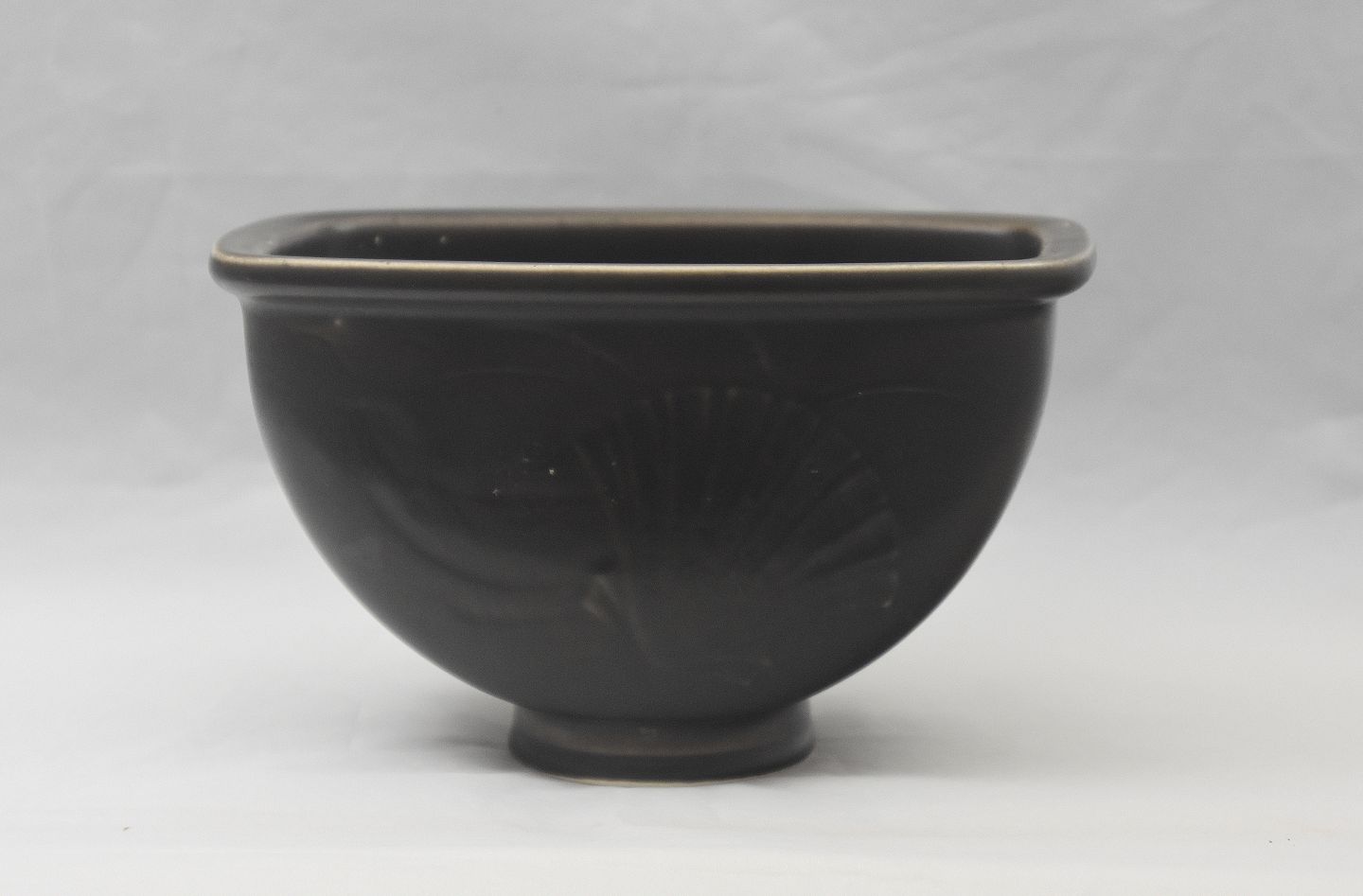 Royal Copenhagen Aluminia Skål "Vuggen" fra serien Solbjerg. "Vuggen" er gråbrun og dekoreret med fisk og muslinger, "Vuggen" er af kunstfajance