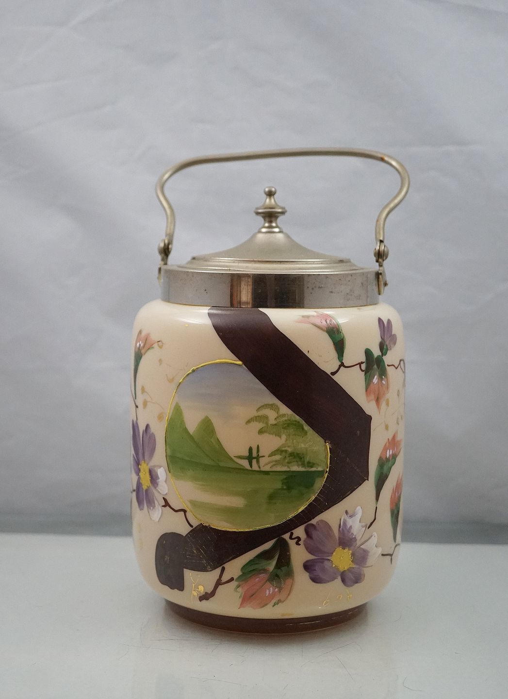 Kiksespand, Bisquitdåse, glas, opal glas, rosa, kinesisk, landskab, blomster, stål