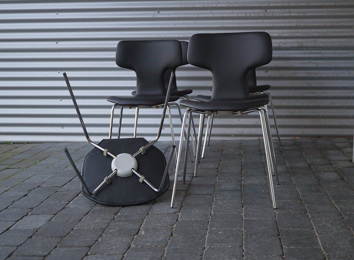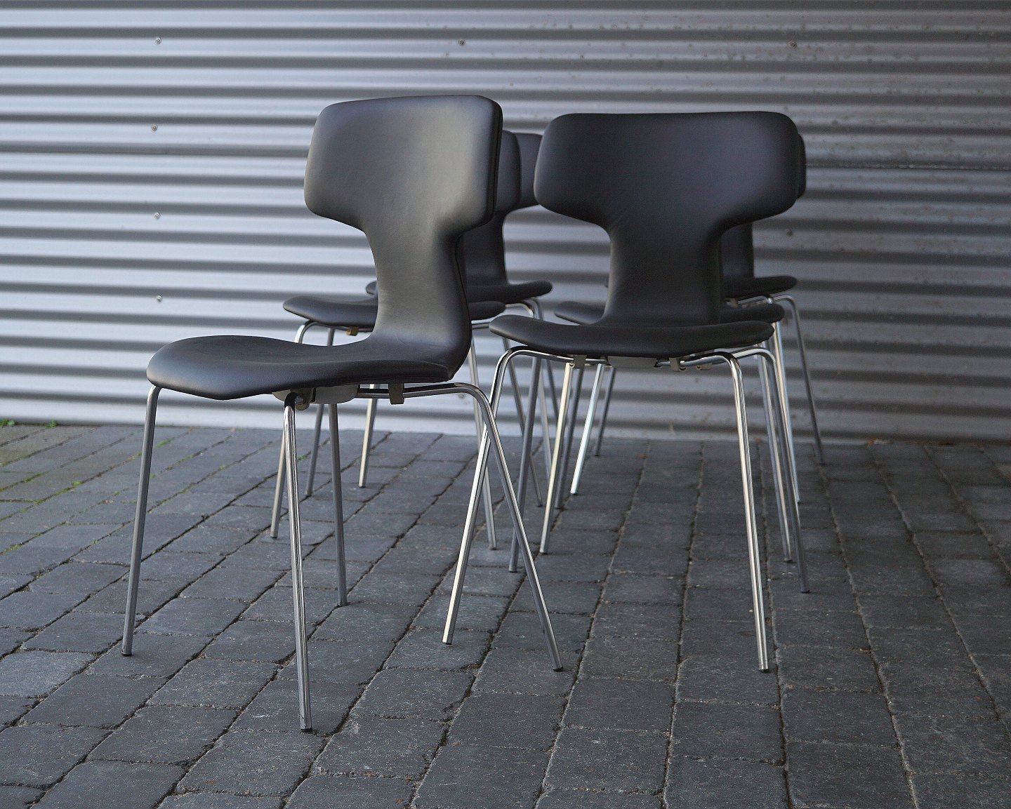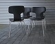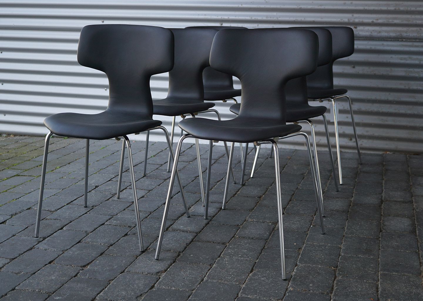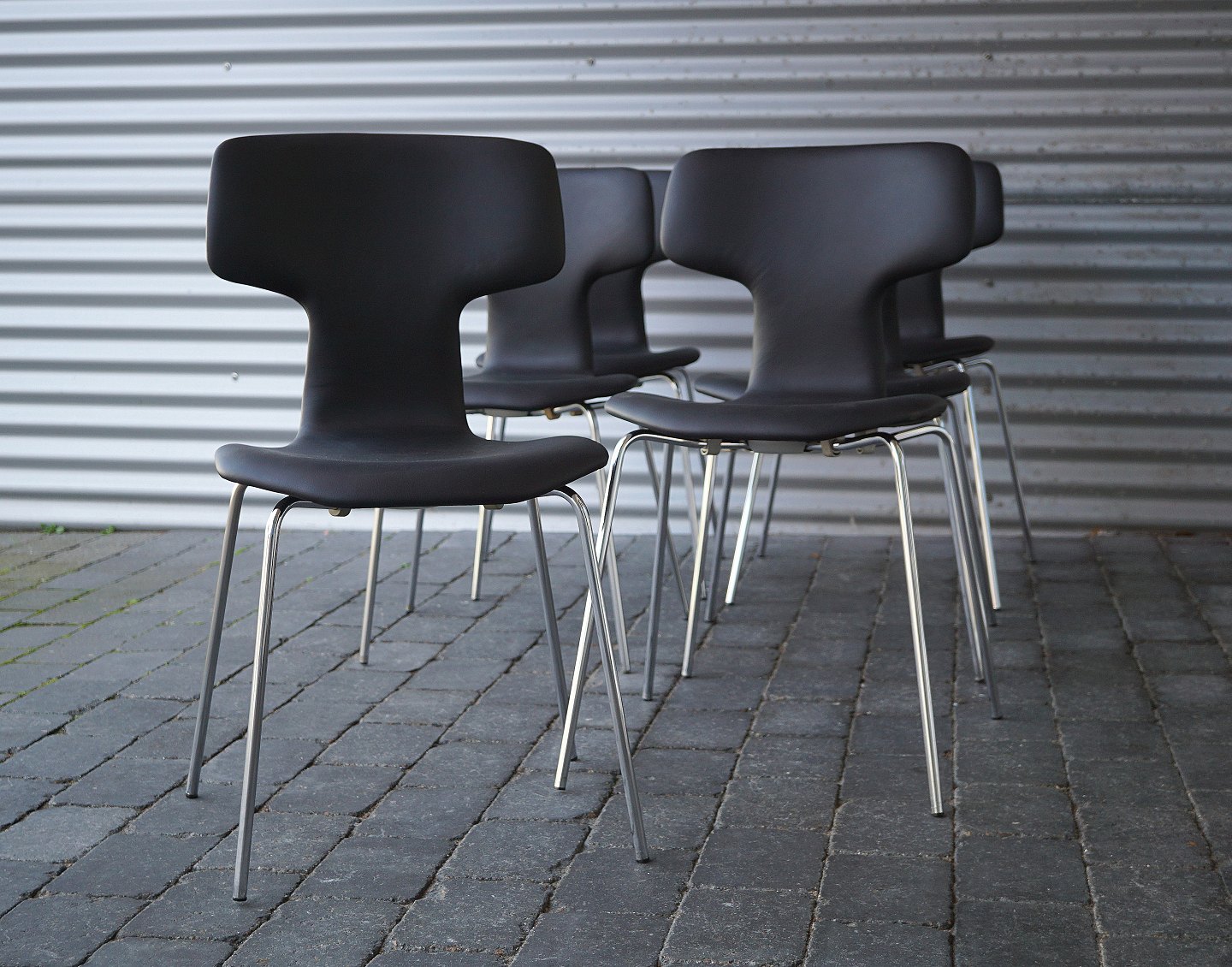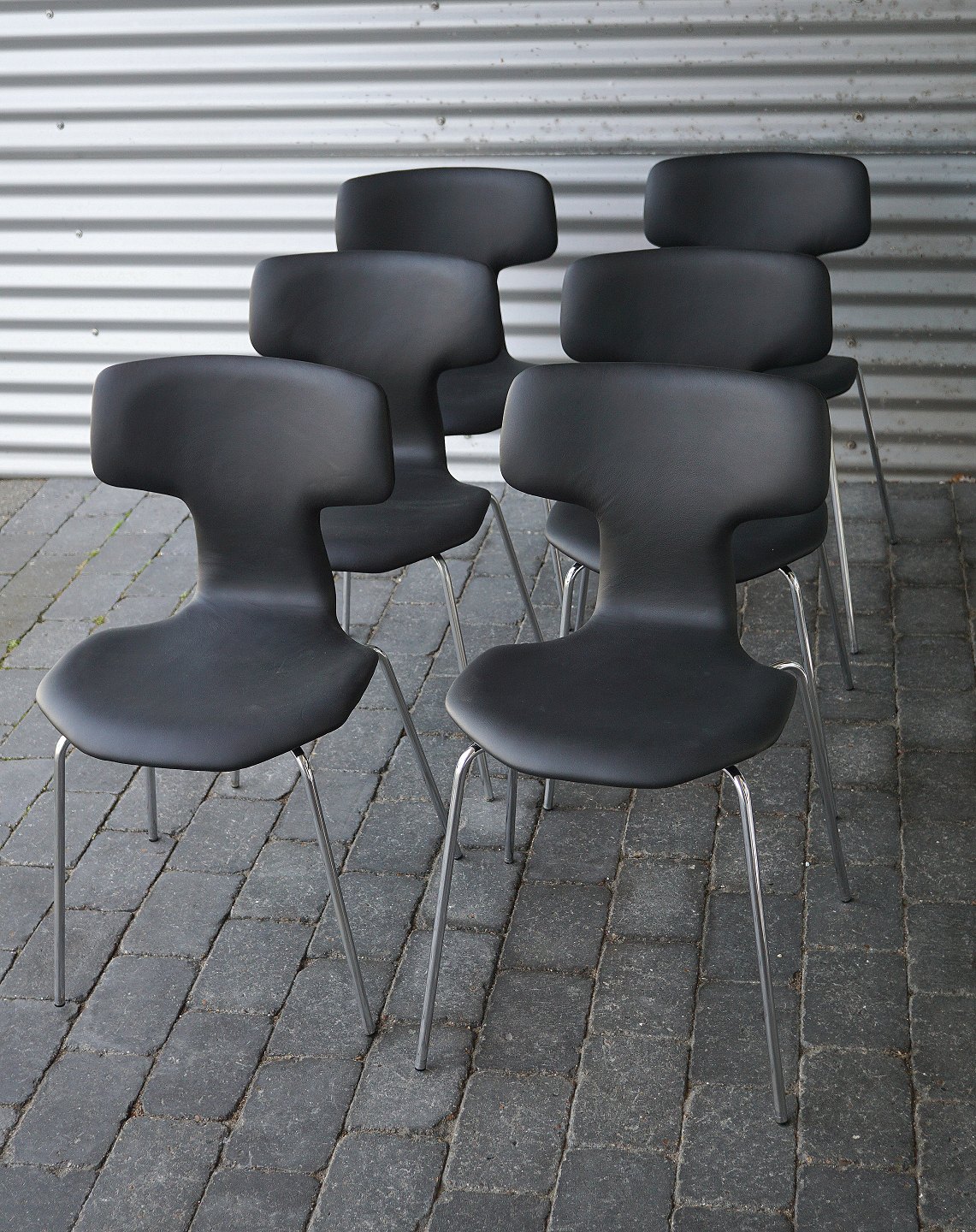 Arne Jacobsen, 6 styk T-stole spisebordsstole. Stolene er ombetrukket med sort læder af klassisk kvalitet.