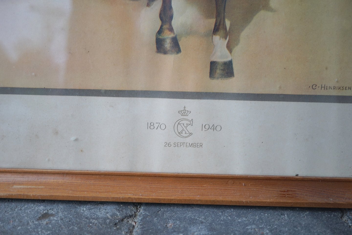 Indrammmet tryk i trærammen med motiv af Kong Christian den tiende til hest med teksten 26. september 1870 - 1940