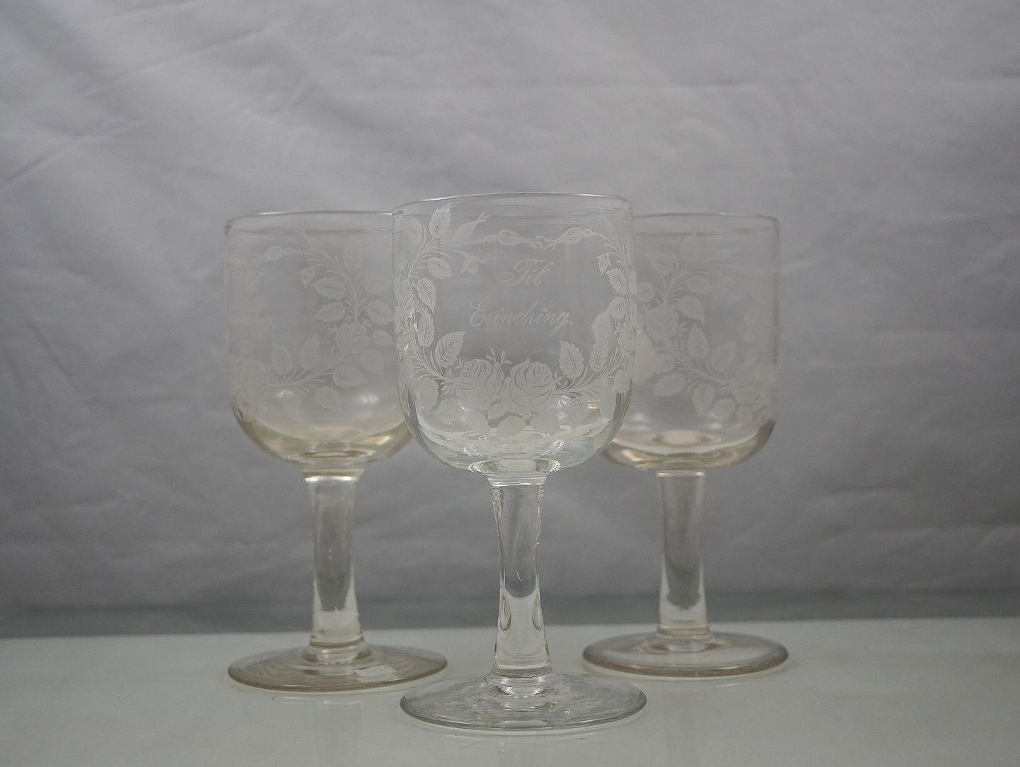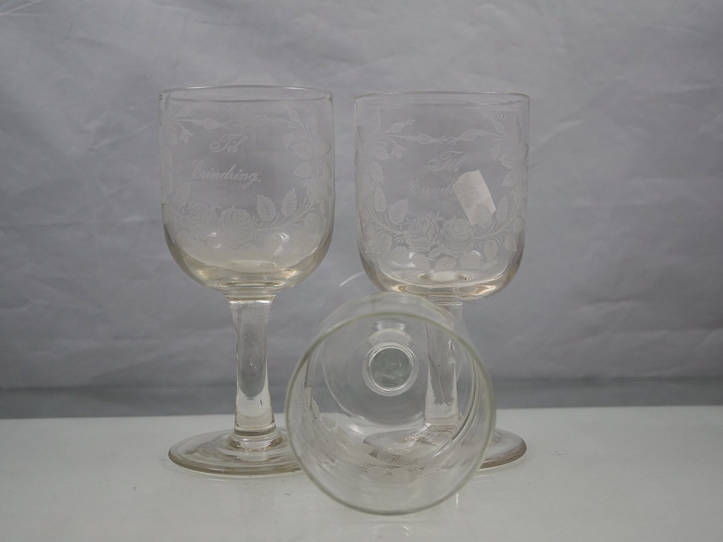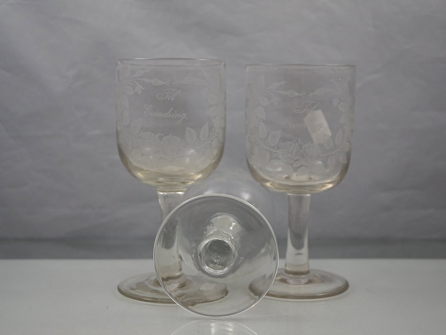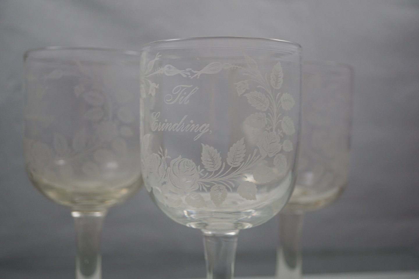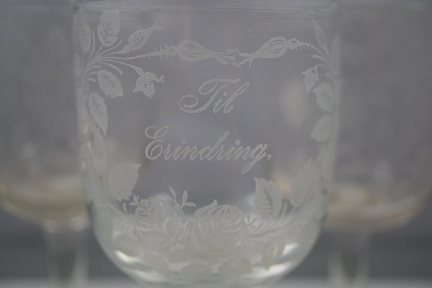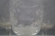 Erindringsglas, klart glas, glat rund stilk med mat ætset blomsterranker og tekst: til erindring.