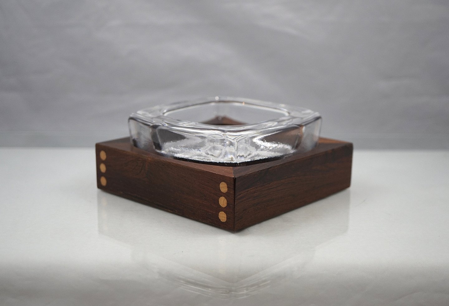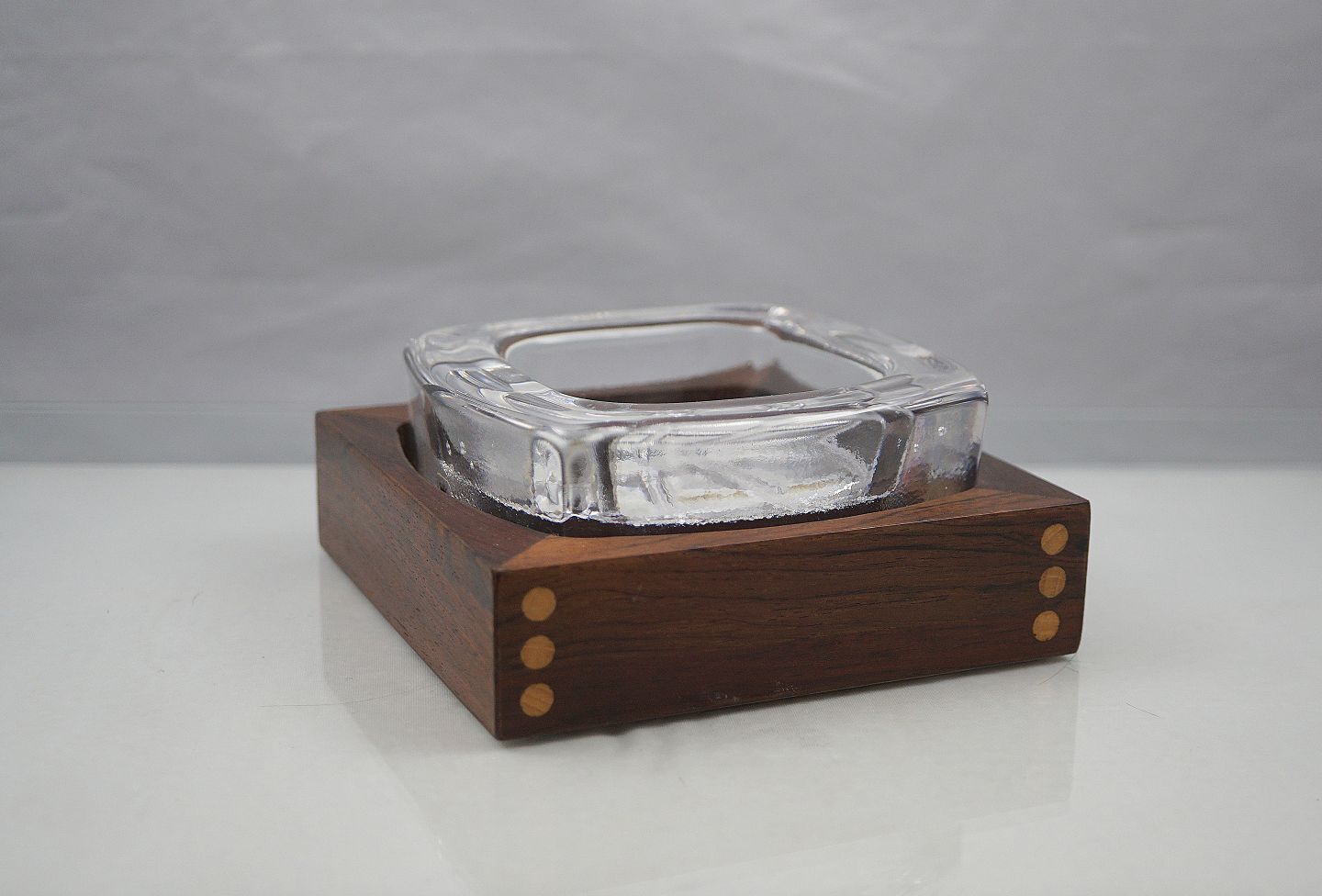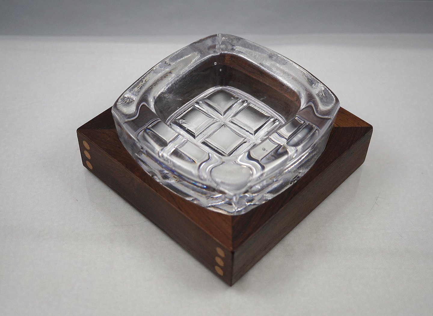 Skruf, Sweden. Tyk glas, med kvadrater i bunden, der står på en ramme af palisandertræ