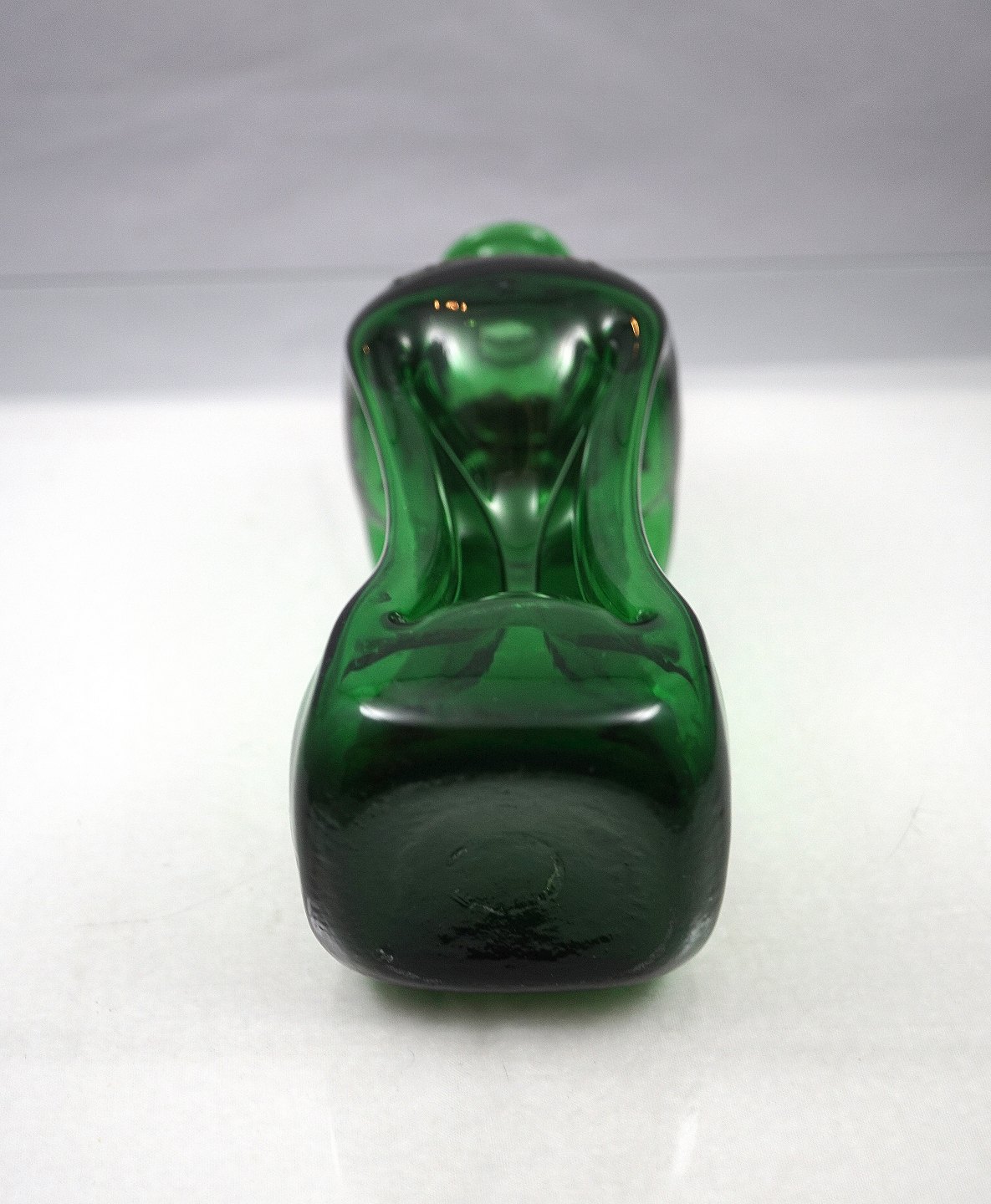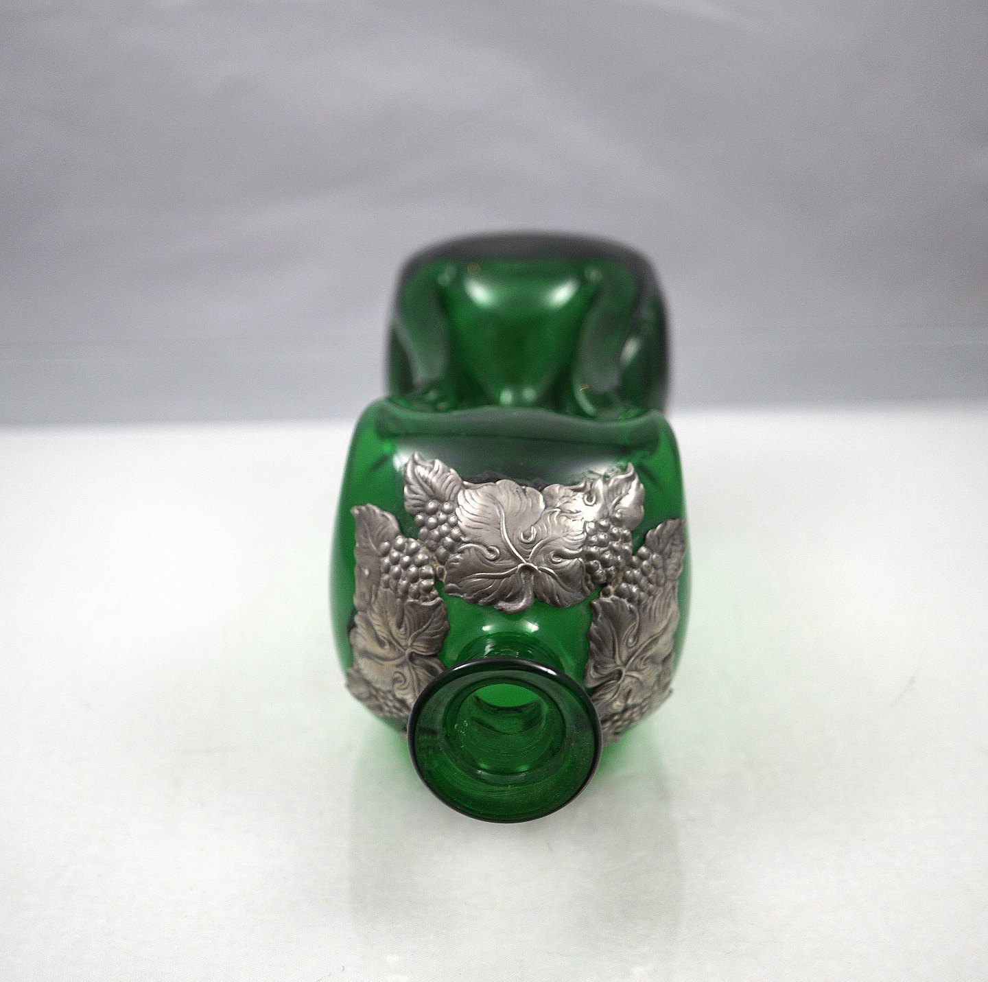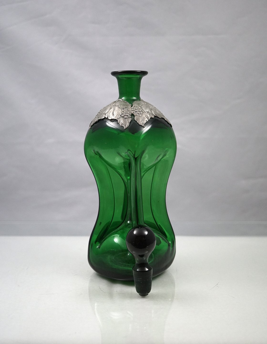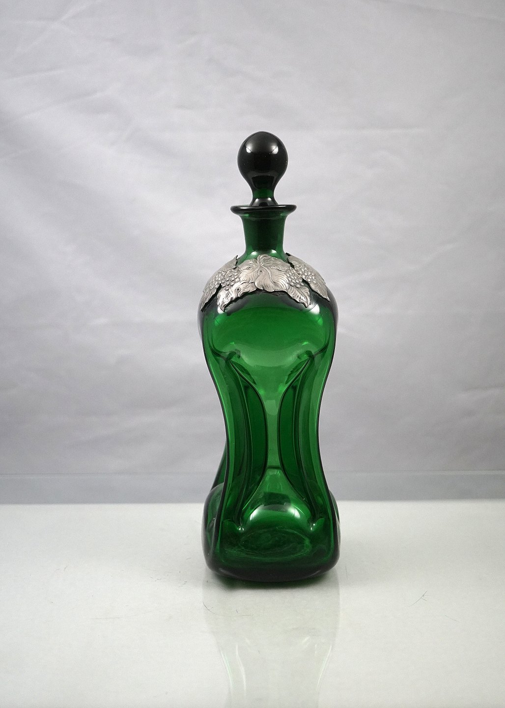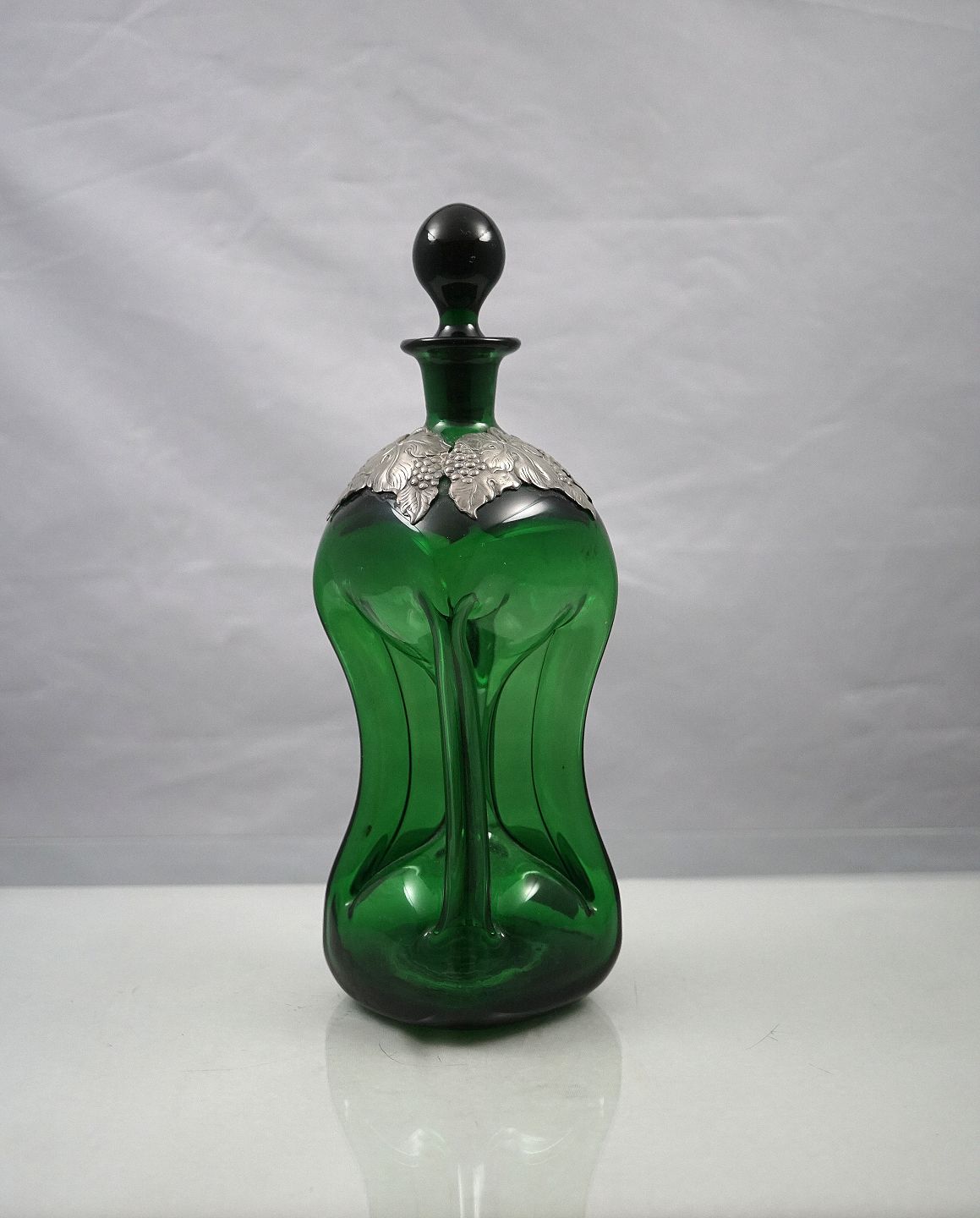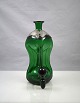 Holmegaard Glasværk. Grøn klukflaske dekoreret med tin, tin der er udformet som vinranker