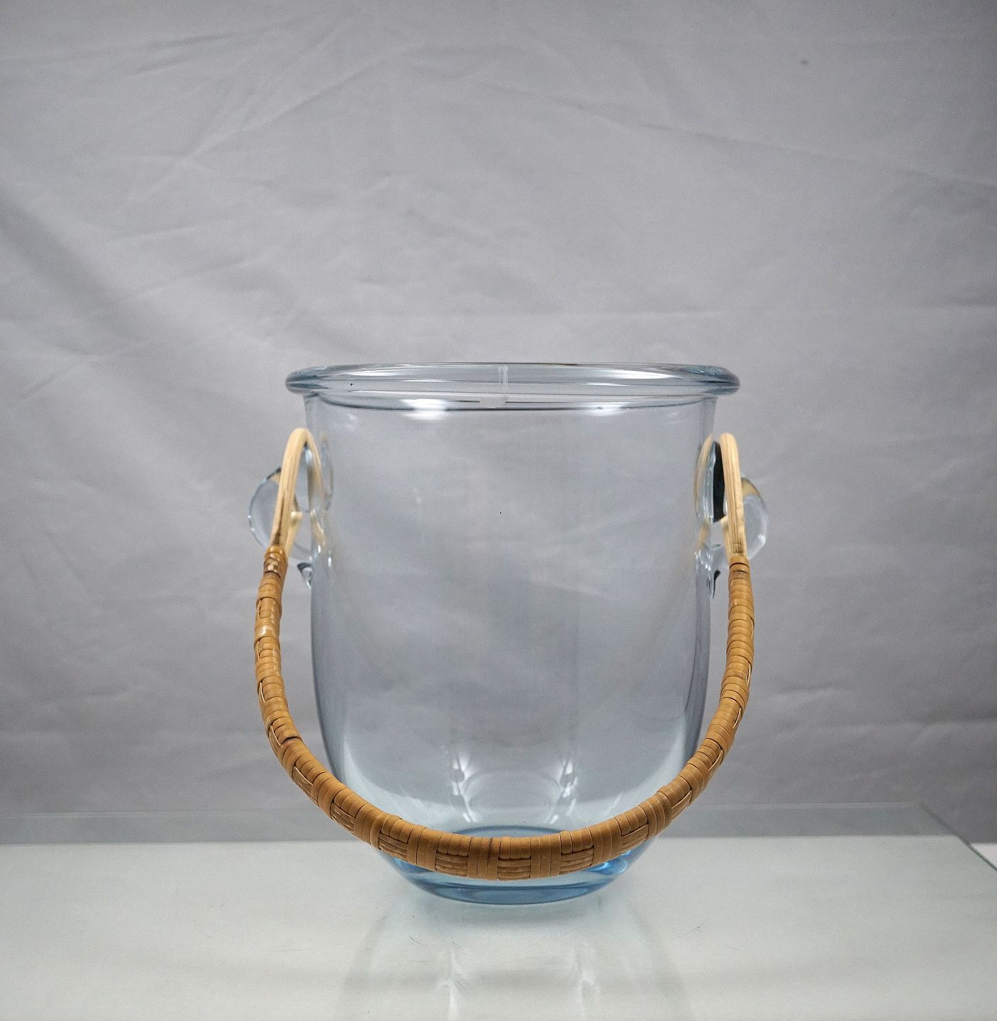 Holmegaard Glasværk, Champagnekøler, i lyst blålig glas og original bast hank. Champagnekøleren er mundblæst med påsatte hanke og udadbuet kant