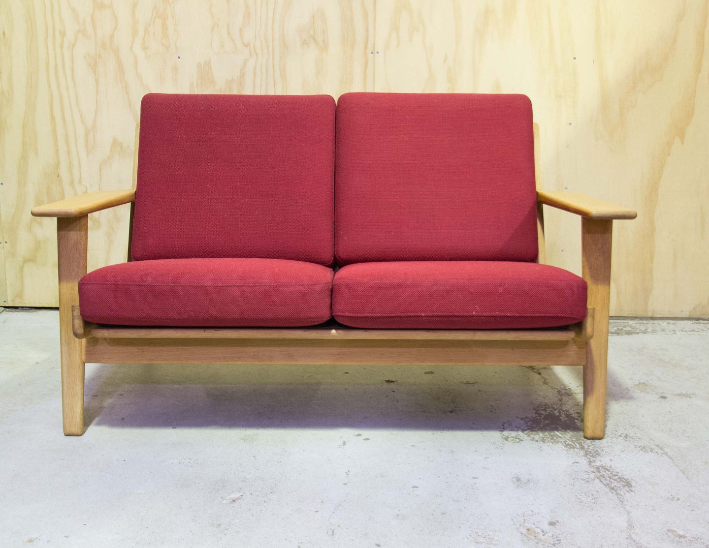 2 personers sofa i sæbebehandlet egetræ med bordeaux uldbetukne hynder. Model GE 290/2, denne er solgt vi har en anden lignende