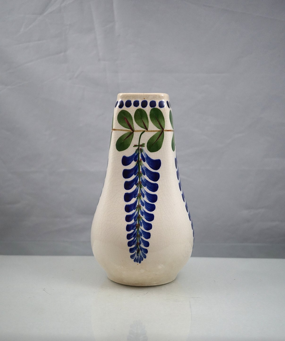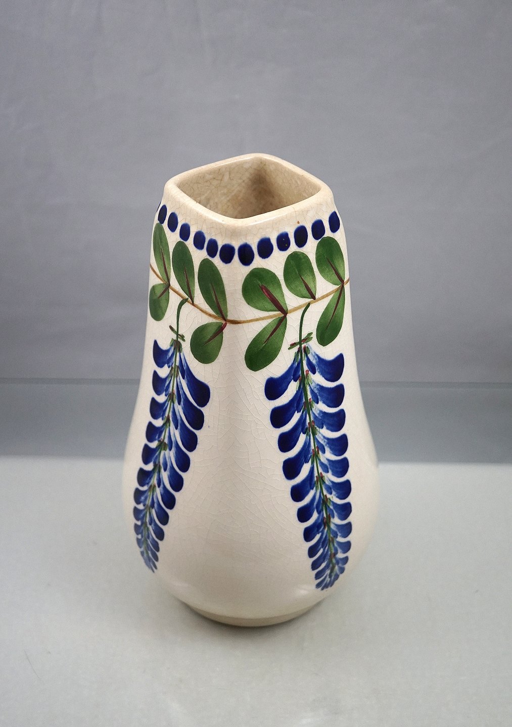 Aluminia. Blå Regn vase nr. 522/110. Vasen er polykrom dekoreret og fremstillet i fajance