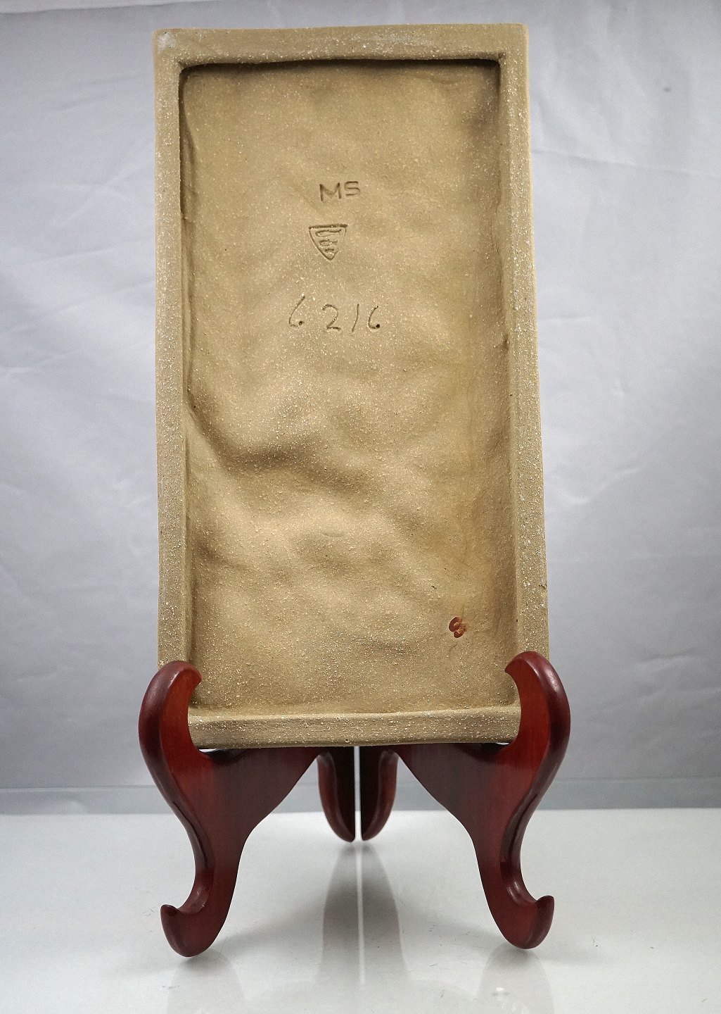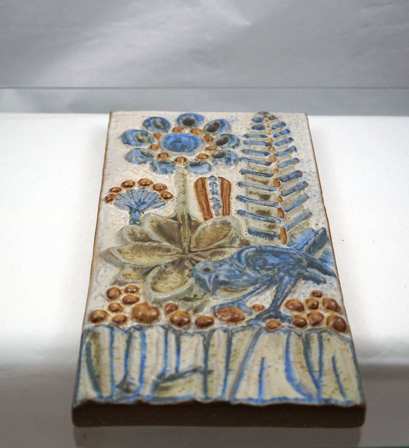 Bornholmsk relief af Michael Andersen, signeret MS, nr. 6216. Relieffet forestiller fugl og blomster, farverne er gennemgående blå