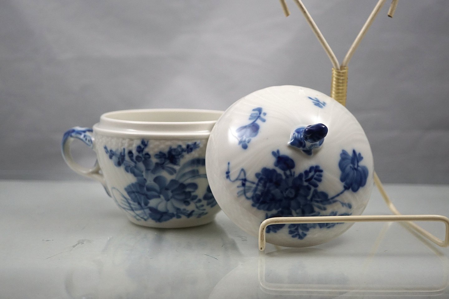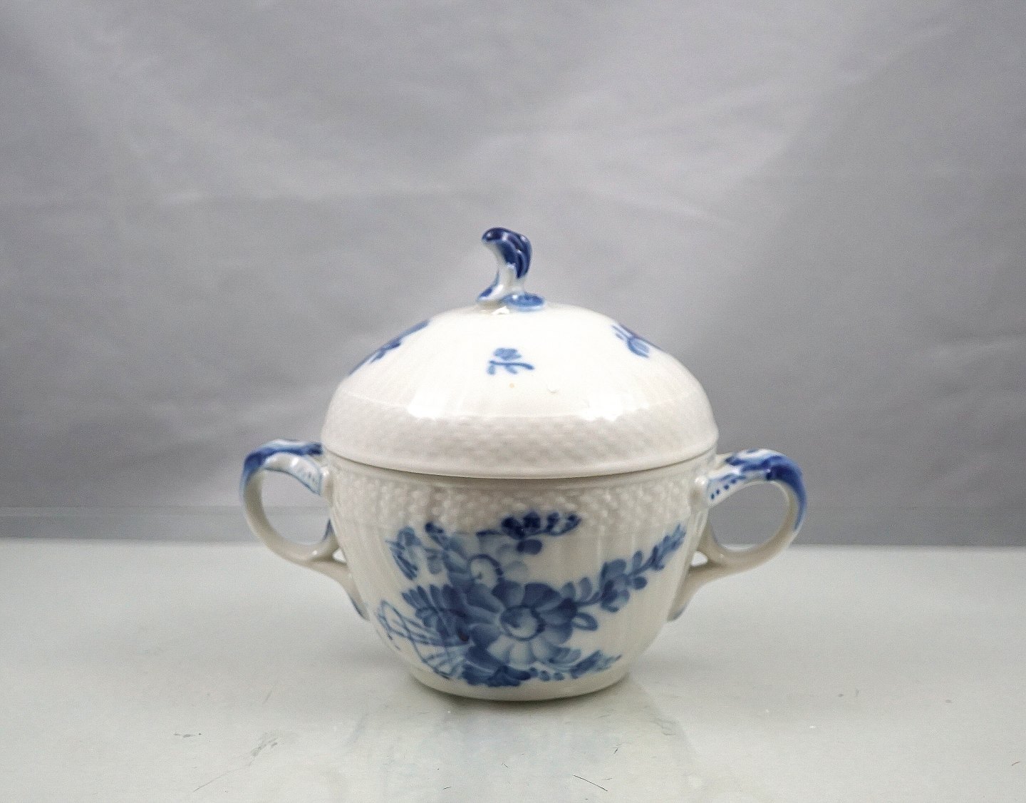 Royal Copenhagen svejfet Blå blomst. Sukkerskål med låg, nr. 10/1680. Sukkerskålen er 1. sortering